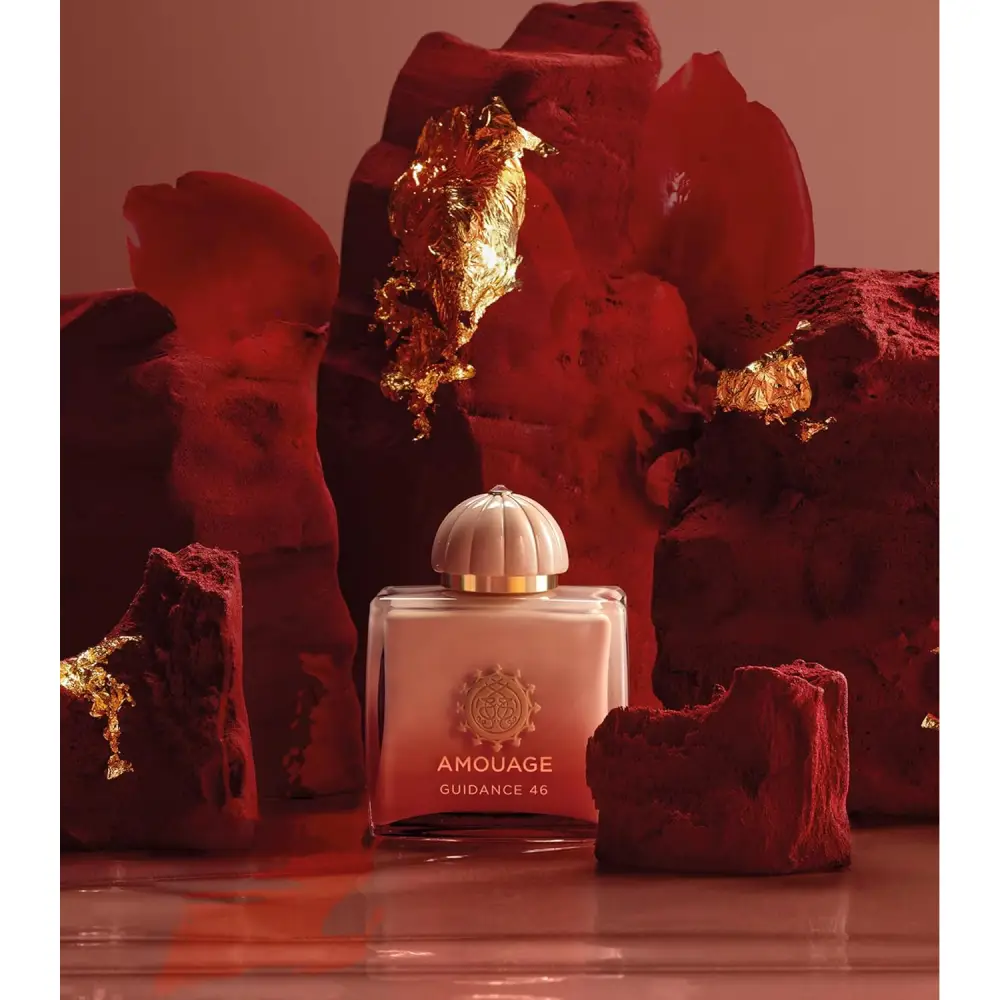 AMOUAGE GUIDANCE 46 FOR UNISEX EXTRAIT DE PARFUM 100 ML Amouage Guidance 46 is a rich and intense extrait de parfum made with a high concentration of perfume oils. It has a warm, creamy, and woody scent with soft floral notes. The fragrance opens with touches of pear, almond, and pink pepper, followed by rose, jasmine, and saffron in the middle. The base is deep and long-lasting with sandalwood, amber, vanilla, and resinous woods. It is designed for both men and women and gives strong, long-lasting performance.