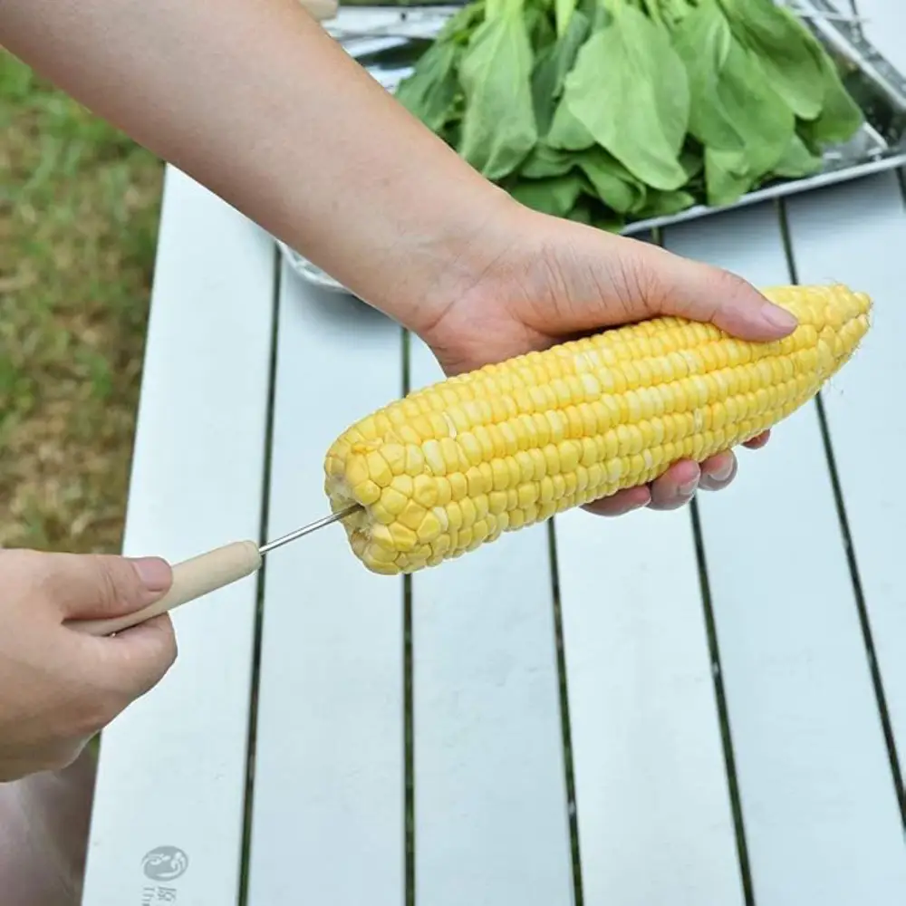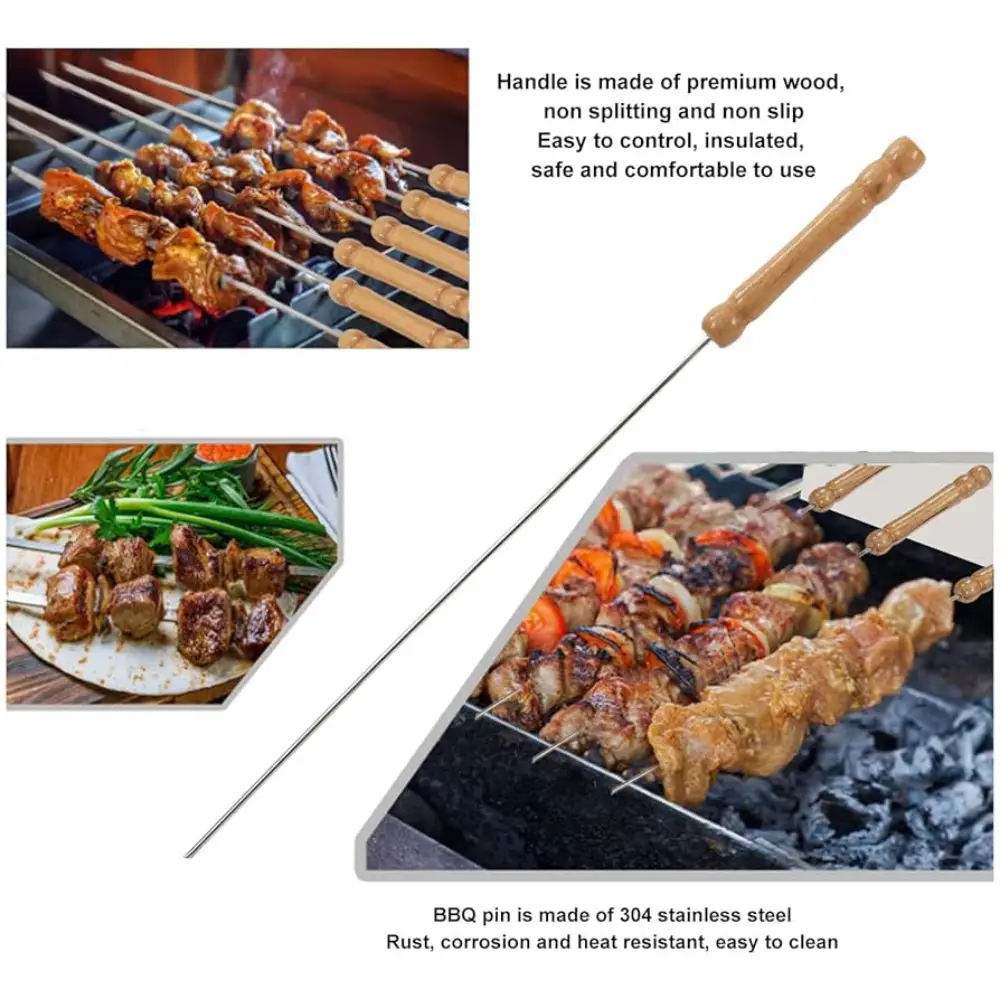 BARBEQUE SKEWER STICK WITH WOODEN HANDLE 4 STICKS Barbeque skewer stick with wooden handle – 4 sticks These are metal barbeque skewers that come with comfortable wooden handles. Each skewer is long and sturdy, designed to hold pieces of meat, vegetables, or seafood while grilling. The wooden handles stay cool, making it easy to turn the food on the grill. The set includes 4 reusable skewers, suitable for home BBQs, outdoor cooking, and grilling.