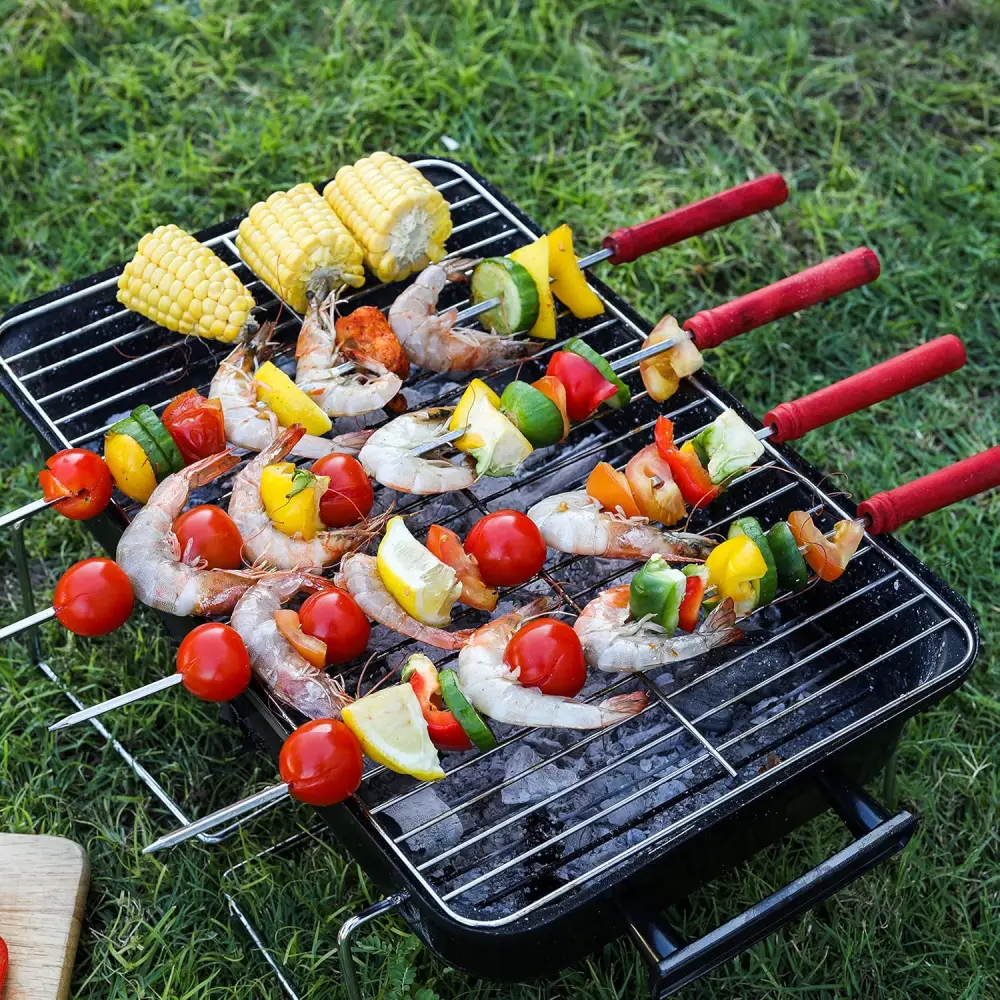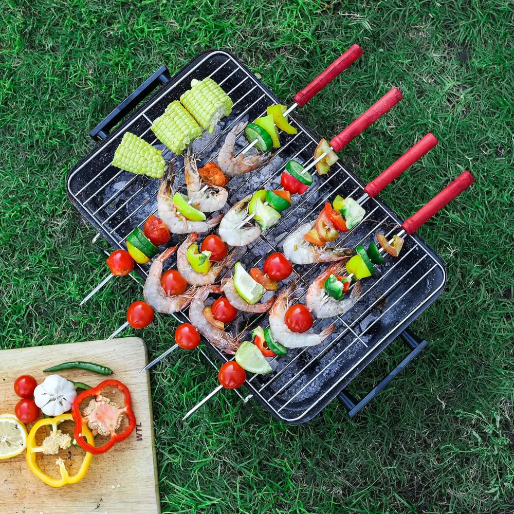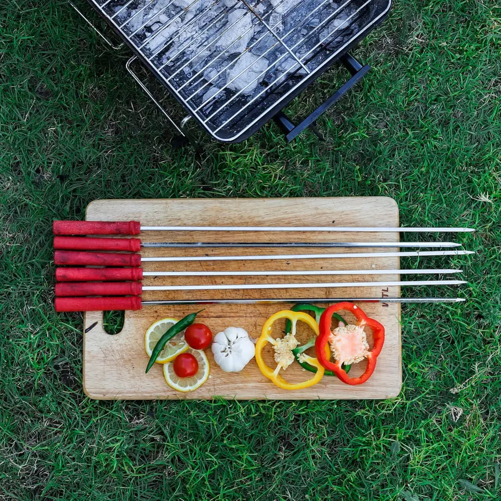 BARBEQUE SKEWERS SET WITH WOODEN HANDLE 6 PCS Barbeque skewers set with wooden handle 6 pcs means a set of six metal skewers made for grilling. Each skewer has a long metal rod for holding meat, vegetables, or kebabs, and a wooden handle at the end to protect your hand from heat. These skewers are reusable, easy to hold, and designed for grilling on a BBQ or charcoal grill.