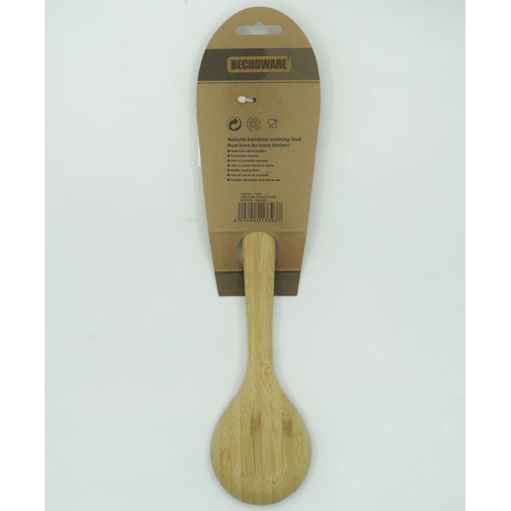 BECHOWARE BAMBOO WOODEN LADLE ROUND SPOON The Bechoware bamboo wooden ladle is a beautifully crafted kitchen tool that combines functionality with a natural aesthetic. Made from sustainable bamboo, it’s lightweight yet sturdy, making it perfect for stirring soups, sauces, and stews. The round spoon design allows for easy scooping and serving, while the smooth finish ensures it won’t scratch your cookware. Bamboo is also naturally resistant to bacteria, making this ladle a hygienic choice for your kitchen. Its eco-friendly materials and elegant look make it a great addition to any culinary collection.