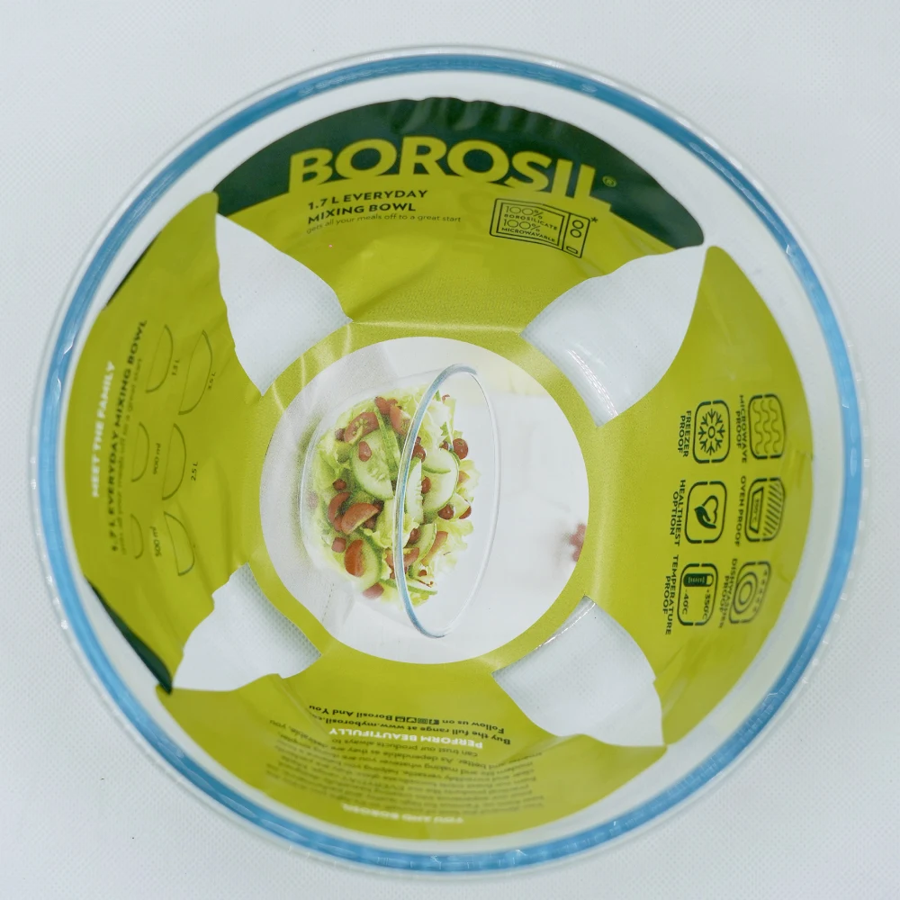 BOROSIL GLASS BOWL 1.7L The Borosil glass bowl (1.7L) is a versatile and practical kitchen item. Here are some key features and benefits: Key Features Durable Borosilicate Glass: Known for its resistance to thermal shock and breakage, making it safe for various uses. Generous Capacity: At 1.7 liters, it’s great for mixing, serving, and storing a variety of foods. Microwave Safe: Ideal for reheating leftovers or melting ingredients. Dishwasher Safe: Easy to clean, making it convenient for everyday use. Non-reactive: Glass doesn’t absorb flavors or odors, ensuring your food tastes fresh. Benefits Versatile Use: Perfect for mixing ingredients, serving salads, or storing leftovers. Healthy Cooking: A safe alternative to plastic, free from harmful chemicals like BPA. Stylish Presentation: Clear glass adds an elegant touch to your table setting.