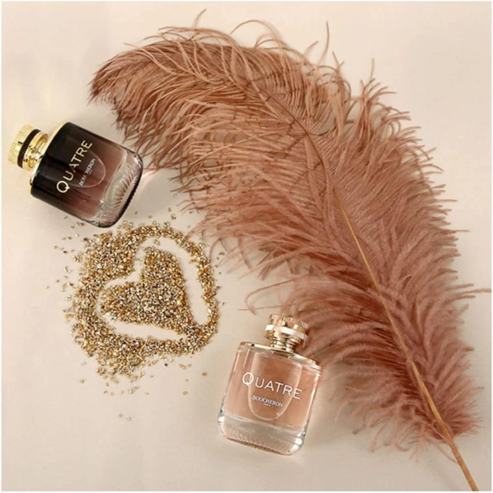 BOUCHERON QUATRE EAU DE PARFUM (EDP) FOR WOMEN 100 ML Fragrance Type: Eau de Parfum (EDP) – Known for its intensity and longevity, ensuring the fragrance lasts throughout the day or evening. Top Notes: Mandarin, Blackcurrant, and Pink Pepper create an invigorating and fruity opening, providing a fresh and energetic burst. Heart Notes: Rose, Jasmine, and Almond give the fragrance a rich, floral, and slightly nutty character, adding depth and warmth. Base Notes: A blend of Cedarwood, Vanilla, and Musk gives the scent a sensual, woody base with a soft sweetness and lasting allure. Bottle Design: The fragrance bottle is inspired by the Quatre ring, featuring a modern and elegant design with golden accents that embody luxury and sophistication. Longevity & Sillage: The EDP formulation provides a long-lasting scent with excellent sillage, ensuring you leave a trail of elegance wherever you go. Versatile Wear: This fragrance is suitable for both daytime and evening wear, making it perfect for work