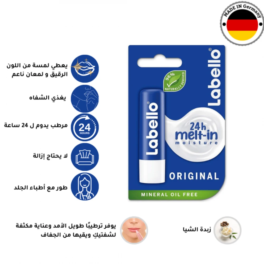 LABELLO 24 H MELT-IN MOISTURE ORIGINAL WITH NATURAL OILS LIP BALM 5.5 ML Labello 24H Melt-in Moisture offers 24-hour long-lasting hydration for your lips. The balm is designed to keep your lips moisturized and soft throughout the day, reducing the need for frequent reapplication. Natural Oils: The balm is enriched with natural oils, which help to nourish and repair dry or cracked lips. These oils, such as shea butter and jojoba oil, are known for their soothing and hydrating properties. Melt-In Texture: One of the standout features of this lip balm is its melt-in texture. The balm glides on smoothly and melts into the lips upon application, offering an instant feeling of comfort and hydration. Light, Non-Greasy Formula: The formula is designed to be lightweight, leaving your lips feeling soft and smooth without a heavy, greasy residue. This makes it ideal for everyday use, as it doesn’t interfere with your makeup or feel uncomfortable on your lips.