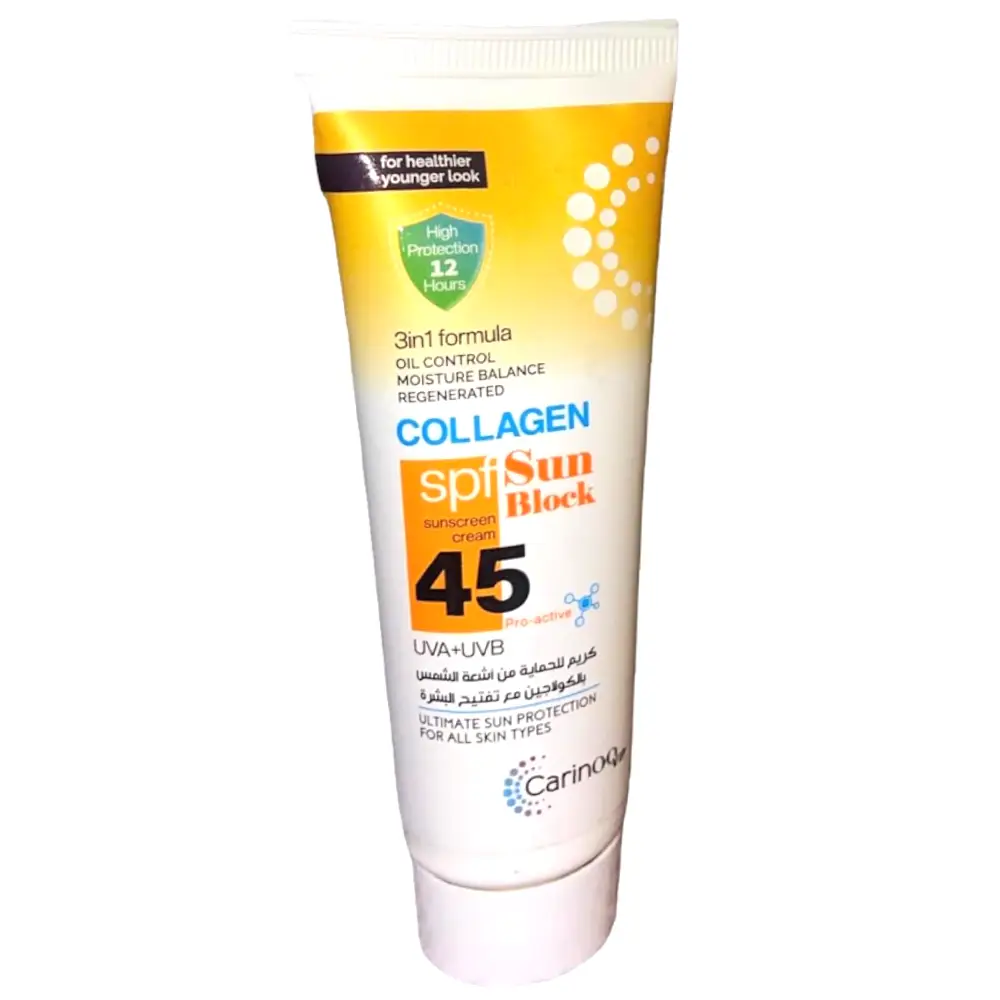 COLLAGEN SPF SUN BLOCK 45 PRO ACTIVE UVA+UVB CREAM (FOR ALL SKIN TYPES) The Carinoo VIP Collagen Sunscreen Cream SPF 45 is a facial sunscreen designed to provide broad-spectrum protection against UVA and UVB rays. Its 3-in-1 formula offers oil control, moisture balance, and skin regeneration, making it suitable for all skin types. Enriched with collagen, it aims to enhance skin elasticity and reduce signs of aging. The lightweight, non-greasy texture ensures comfortable wear without leaving a white cast.