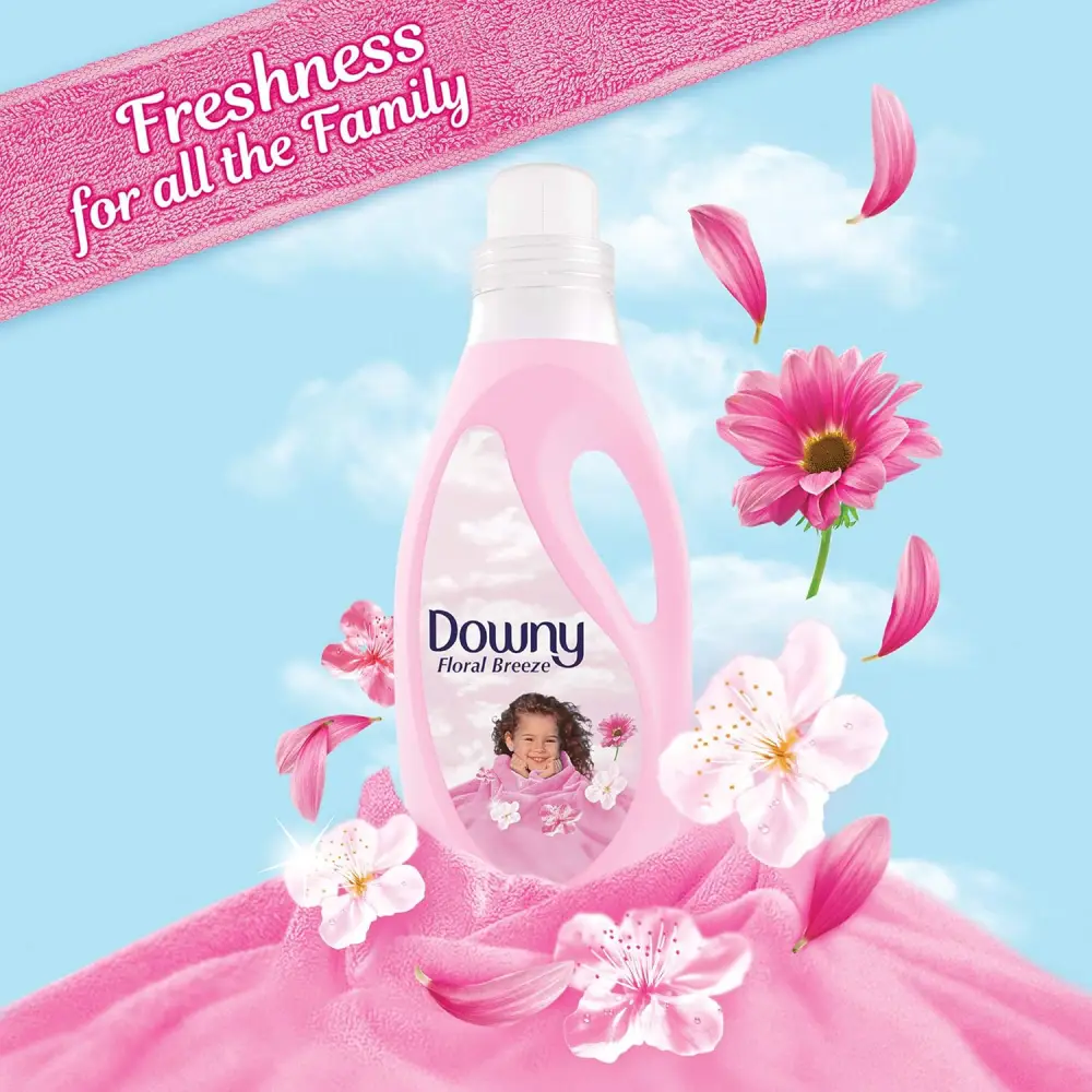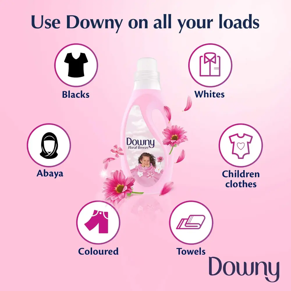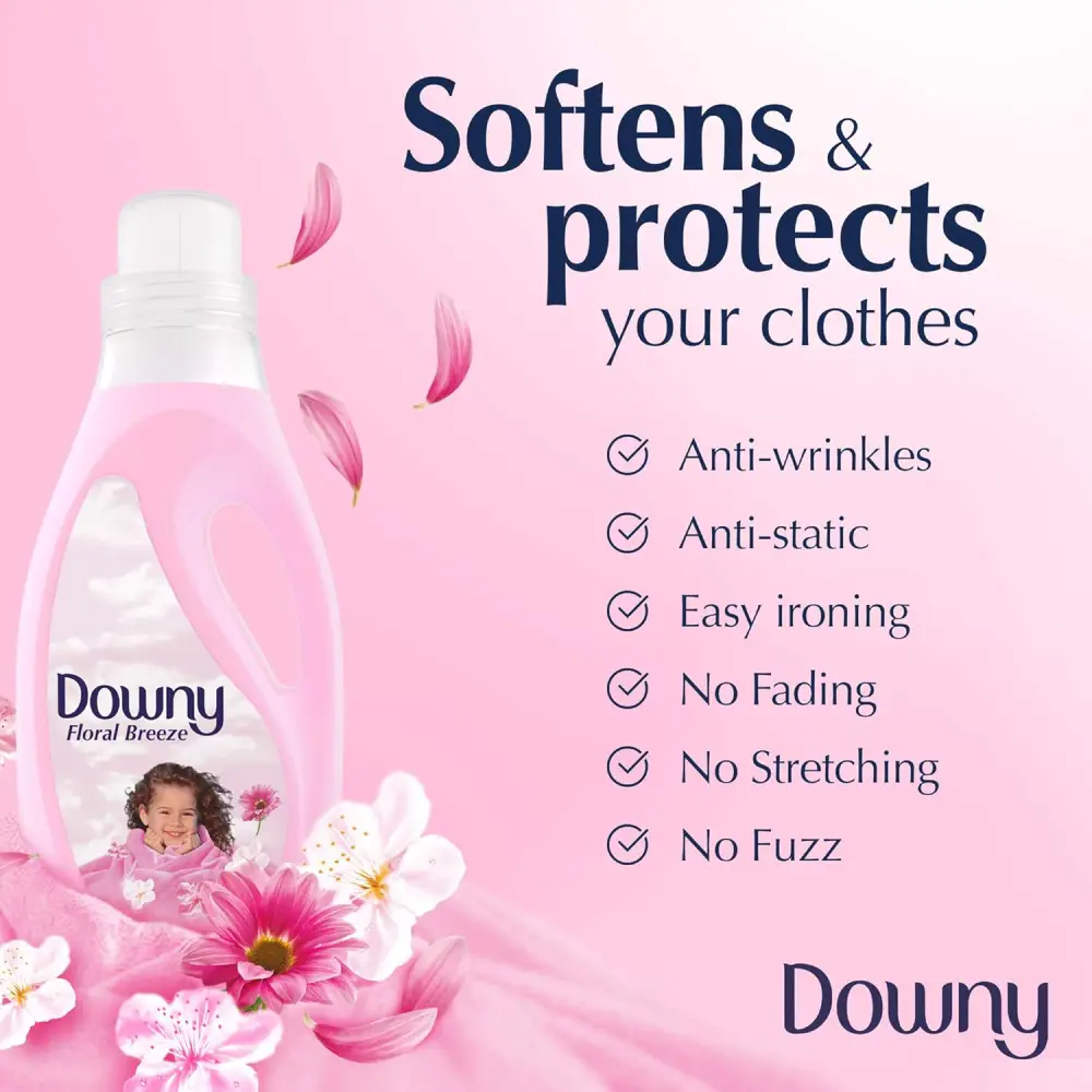 DOWNY FLORAL BREEZE PINK 18 WASHES REGULAR FABRIC SOFTENER 2 L Type: Fabric softener liquid Scent: Floral Breeze (light, fresh, sweet floral aroma) Size: 2 Litres Use: Added during laundry rinse cycle Purpose: Softens clothes, reduces roughness, and leaves a gentle scent Suitable for: Both hand wash and washing machines Note: Do not use on towels if you want to keep high absorbency (optional preference)