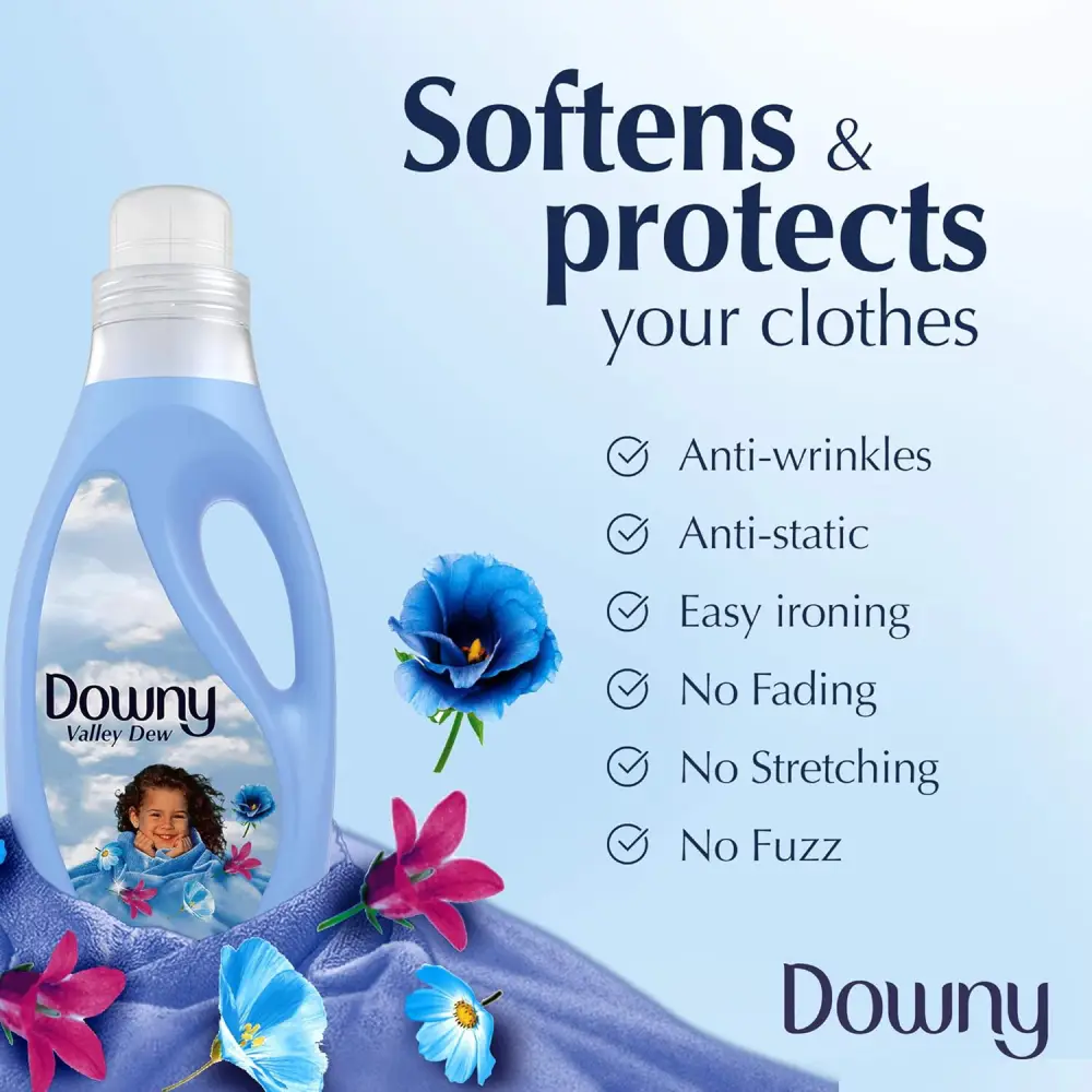 DOWNY VALLEY DEW BLUE REGULAR FABRIC SOFTENER 2 L This is a liquid fabric softener used after washing clothes. It helps make clothes feel softer and smoother. Leaves a light fresh “cool breeze” type fragrance on fabrics. Helps reduce wrinkles and makes ironing easier. Suitable for everyday clothes, towels, and bed sheets.