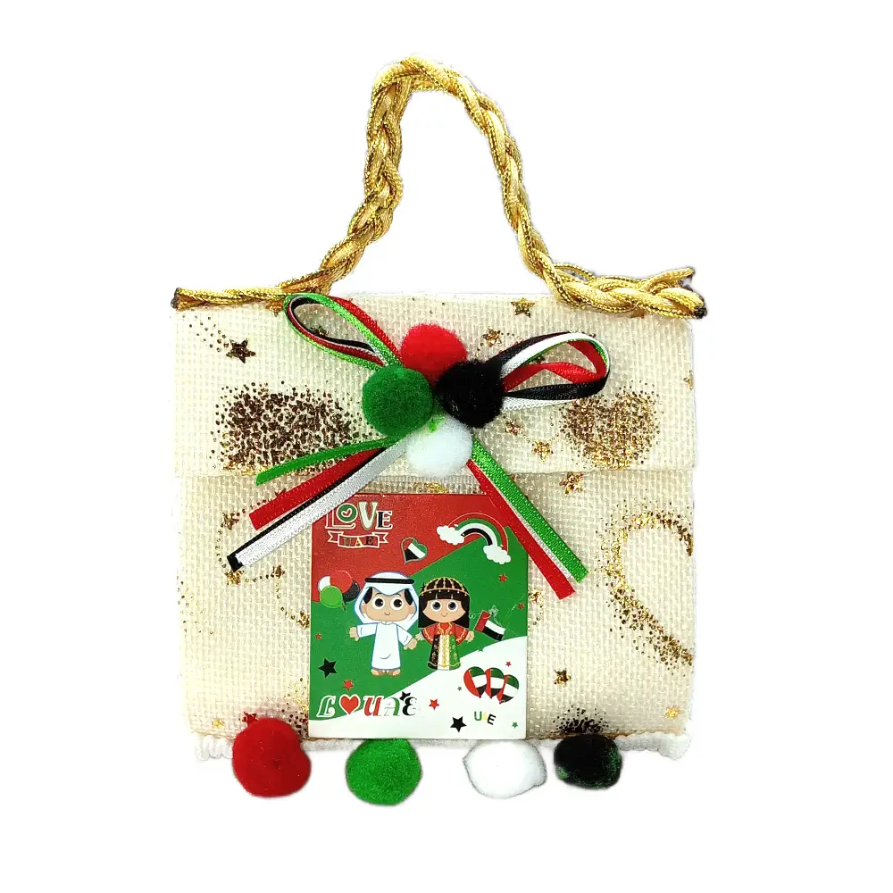DP UAE NATIONAL DAY GIFTS BAG Design: A small, sturdy bag in the colors of the UAE flag (red, green, white, and black) or featuring the UAE emblem or iconic landmarks (such as the Burj Khalifa or Sheikh Zayed Grand Mosque). Material: Opt for fabric bags (like cotton or jute) or eco-friendly reusable bags for a sustainable touch. Style: A simple, elegant design with minimal decoration, or a more festive one with vibrant, celebratory patterns and symbols of the UAE. Personalization: You can add a personal touch by having the bags customized with a greeting like "Happy UAE National Day" or the year. These small gift bags should be simple, easy to carry, and reflect the national pride of the occasion!