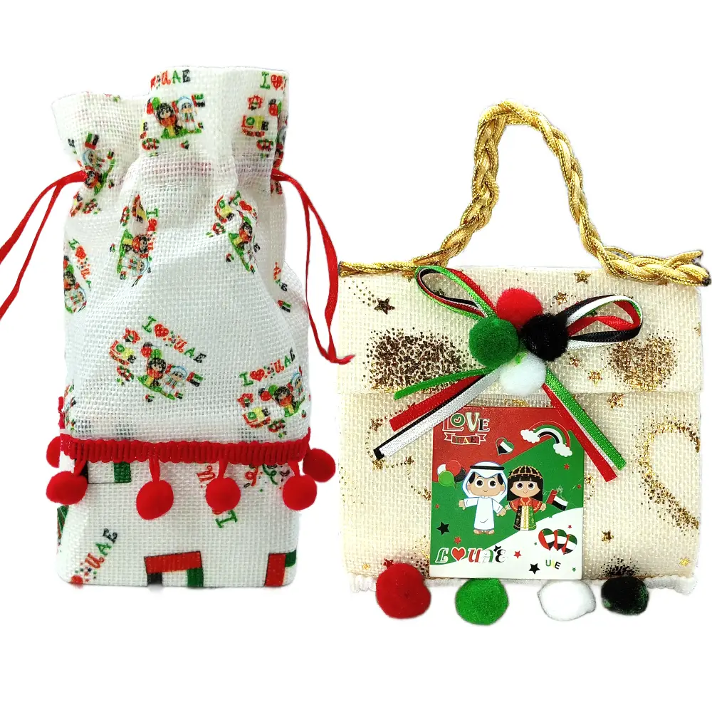 DP UAE NATIONAL DAY GIFTS BAG Design: A small, sturdy bag in the colors of the UAE flag (red, green, white, and black) or featuring the UAE emblem or iconic landmarks (such as the Burj Khalifa or Sheikh Zayed Grand Mosque). Material: Opt for fabric bags (like cotton or jute) or eco-friendly reusable bags for a sustainable touch. Style: A simple, elegant design with minimal decoration, or a more festive one with vibrant, celebratory patterns and symbols of the UAE. Personalization: You can add a personal touch by having the bags customized with a greeting like "Happy UAE National Day" or the year. These small gift bags should be simple, easy to carry, and reflect the national pride of the occasion!