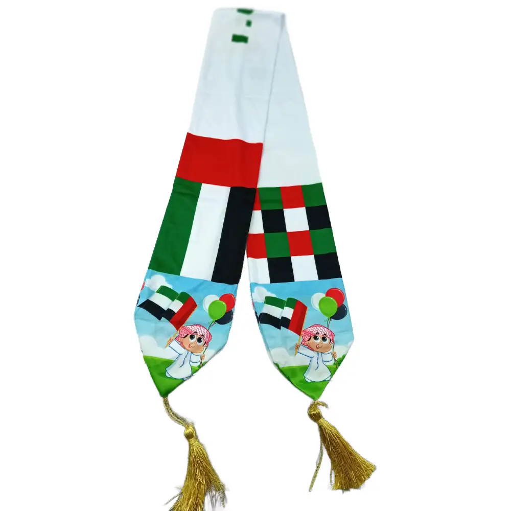 DP UAE NATIONAL DAY SCARF UAE National Day Scarf: A scarf designed specifically for the UAE National Day celebrations, typically featuring the colors of the UAE flag—red, green, white, and black. Design: The scarf may have a vibrant pattern of the UAE flag It’s made from lightweight fabric, perfect for wearing during National Day events, parades, or gatherings. A UAE National Day Scarf is a stylish and patriotic accessory that can be worn around the neck, as a headscarf, or draped over your shoulders to show your national pride.