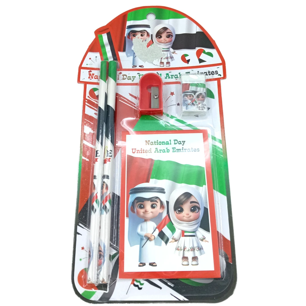 DP UAE NATIONAL DAY STATIONERY PENCIL SET The "DP UAE National Day Stationery Pencil Set" that includes an eraser and sharpener is a fantastic way to celebrate UAE National Day. Here’s an overview of what this set typically includes: Features: Contents: Pencils: Several pencils, often decorated with the colors of the UAE flag (red, green, white, and black) and possibly featuring national symbols or designs. Eraser: A themed eraser, designed to match the UAE National Day spirit. Sharpener: A practical sharpener for keeping the pencils in good condition. Design: All items are usually styled to reflect the national pride of the UAE, making them festive and visually appealing. Uses: School Supplies: Ideal for students to use in class, especially during National Day celebrations. Creative Projects: Perfect for arts and crafts, encouraging creativity while honoring national heritage. Gifts: A thoughtful gift for friends, family, or colleagues