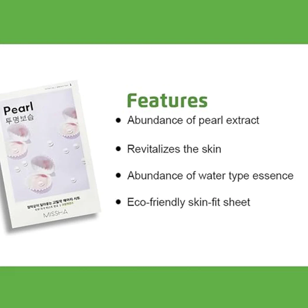 MISSHA PEARL AIRY FIT SHEET FACE MASK 19 G The pearl extract in this mask is known for its ability to promote radiant skin. It helps to brighten dull skin, giving it a healthy, youthful glow. Pearl is also rich in amino acids and minerals that help to nourish and rejuvenate the skin. Airy Fit Sheet Material: The mask features Airy Fit sheet technology, which is designed to be ultra-thin, lightweight, and breathable. This allows for a perfect fit on the face, ensuring the serum is absorbed effectively and that the mask stays in place during use. Brightening Effect: The primary benefit of the pearl extract is its ability to even out skin tone and promote radiance. This makes the Missha Pearl Airy Fit Sheet Mask an ideal choice for anyone looking to revitalize dull, uneven skin or anyone wanting to add a natural glow to their complexion. Hydrating and Soothing: This sheet mask provides deep hydration, helping to restore moisture to dry skin.