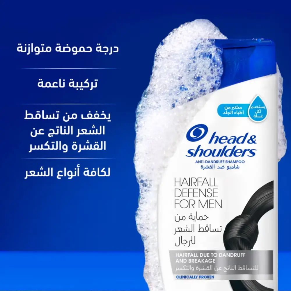 HEAD & SHOULDERS HAIRFALL DEFENSE FOR MEN ANTI DANDRUFF SHAMPOO 400 ML A men’s shampoo made by Head & Shoulders. Designed to fight dandruff while also helping reduce hair fall caused by breakage. ⚡ How it works Anti-dandruff action – Contains an active ingredient (Piroctone Olamine) that fights dandruff-causing microbes, helping stop flakes, itch, and scalp irritation. Hairfall defense – Strengthens hair from the root to the tip, so hair breaks less during combing/washing. Gentle daily use – Can be used every day, even on oily hair or sensitive scalp.