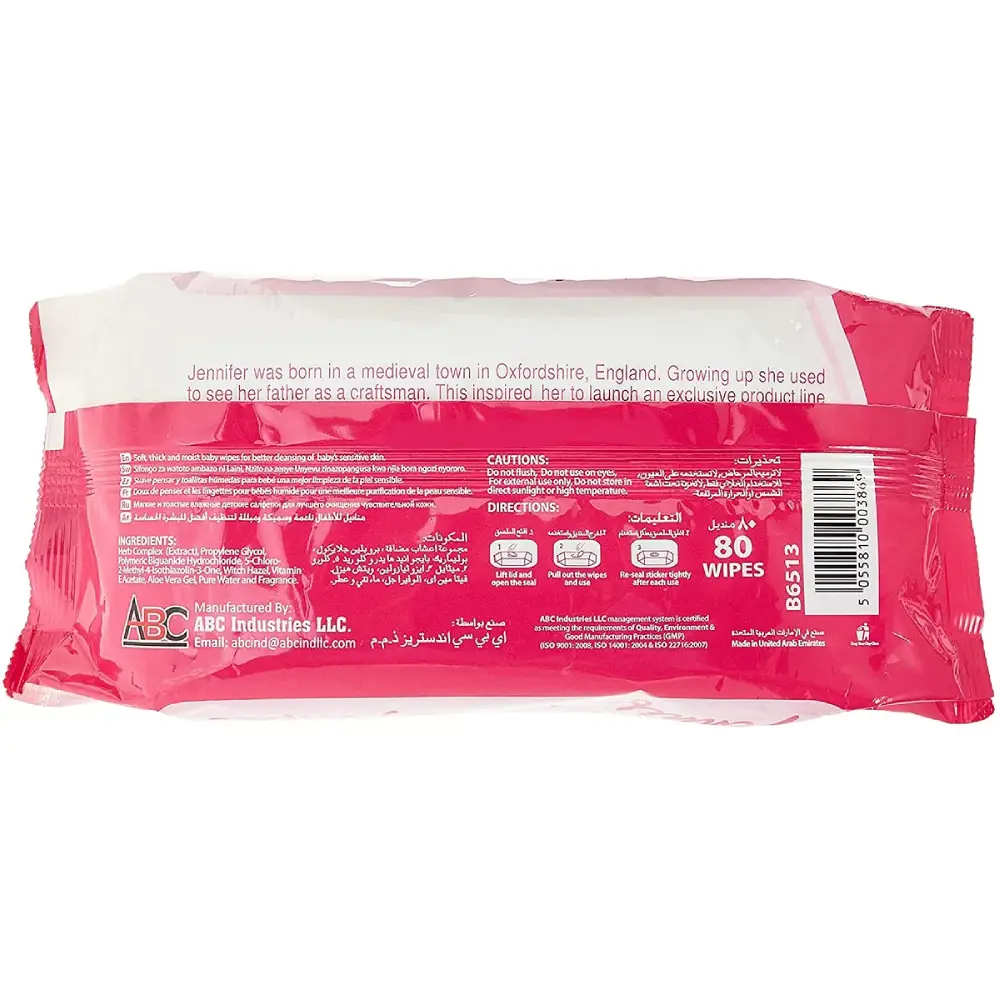 JENNIFER'S BABY WIPES, 80 WIPES ULTRA SOFT: Crafted for your baby’s delicate skin, these wipes are exceptionally soft for gentle cleaning. ALCOHOL-FREE: Free from alcohol to avoid dryness and irritation, ensuring they’re safe for everyday use. EXTRA GENTLE: Designed for sensitive skin, these wipes offer a soothing and tender touch. HYPOALLERGENIC: Formulated with hypoallergenic ingredients to reduce the risk of allergies. VERSATILE USE: Perfect for diaper changes, as well as face and hand cleaning, keeping your little one fresh and clean.