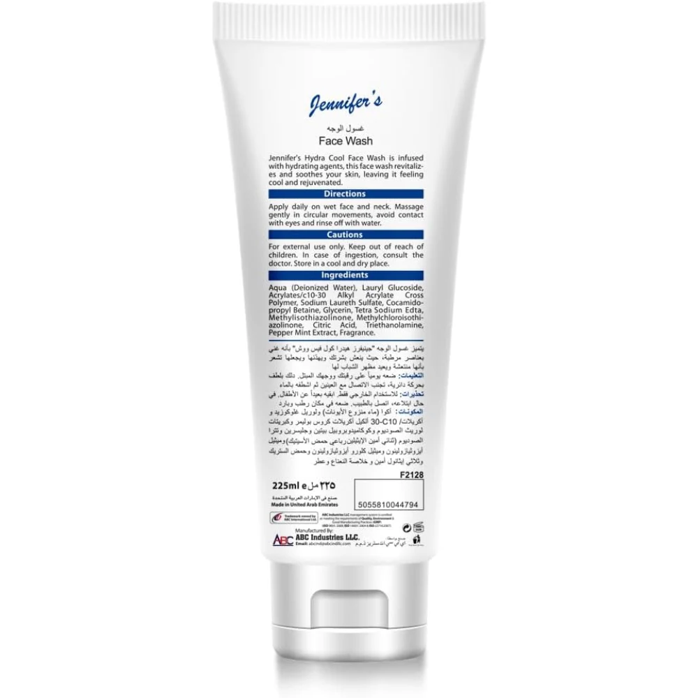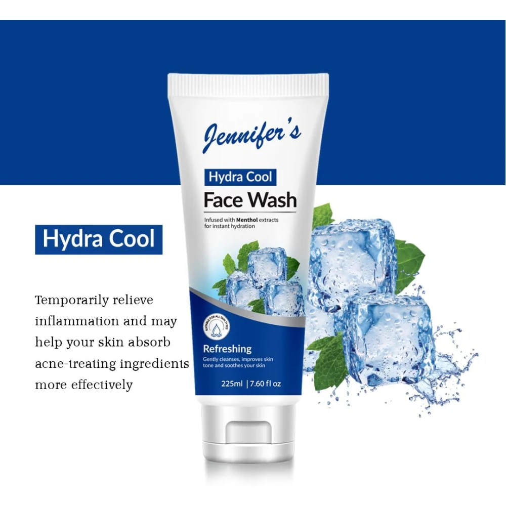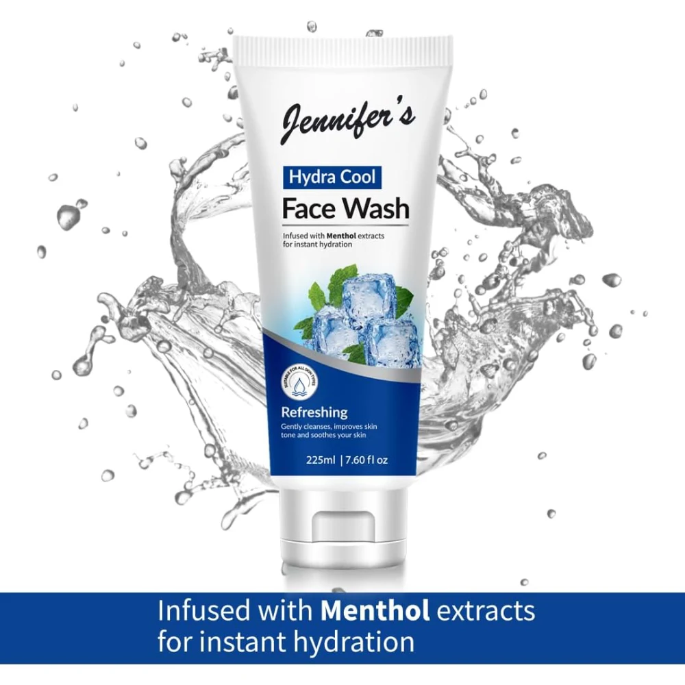 JENNIFERS HYDRA COOL FACE WASH REFRESHING GENTLY CLEANSES, IMPROVES SKIN TONE AND SOOTHES YOUR SKIN 225 ML Hydrating Agents: Often includes ingredients like aloe vera or glycerin that help retain moisture in the skin. Gentle Cleansers: Formulated with mild surfactants to cleanse without stripping essential oils. Benefits: Gentle Cleansing: Effectively removes dirt, makeup, and impurities while being gentle on the skin. Improves Skin Tone: Regular use can enhance overall skin tone and texture, promoting a more radiant complexion. Soothing Properties: Ingredients that soothe and calm the skin can help reduce irritation and redness, making it suitable for sensitive skin types. Refreshing Feel: Leaves the skin feeling cool and revitalized, perfect for morning and evening routines. Usage: Wet your face with water. Apply a small amount of the face wash and lather it in your palms. Massage gently onto your face in circular motions. Rinse thoroughly with water and pat dry.