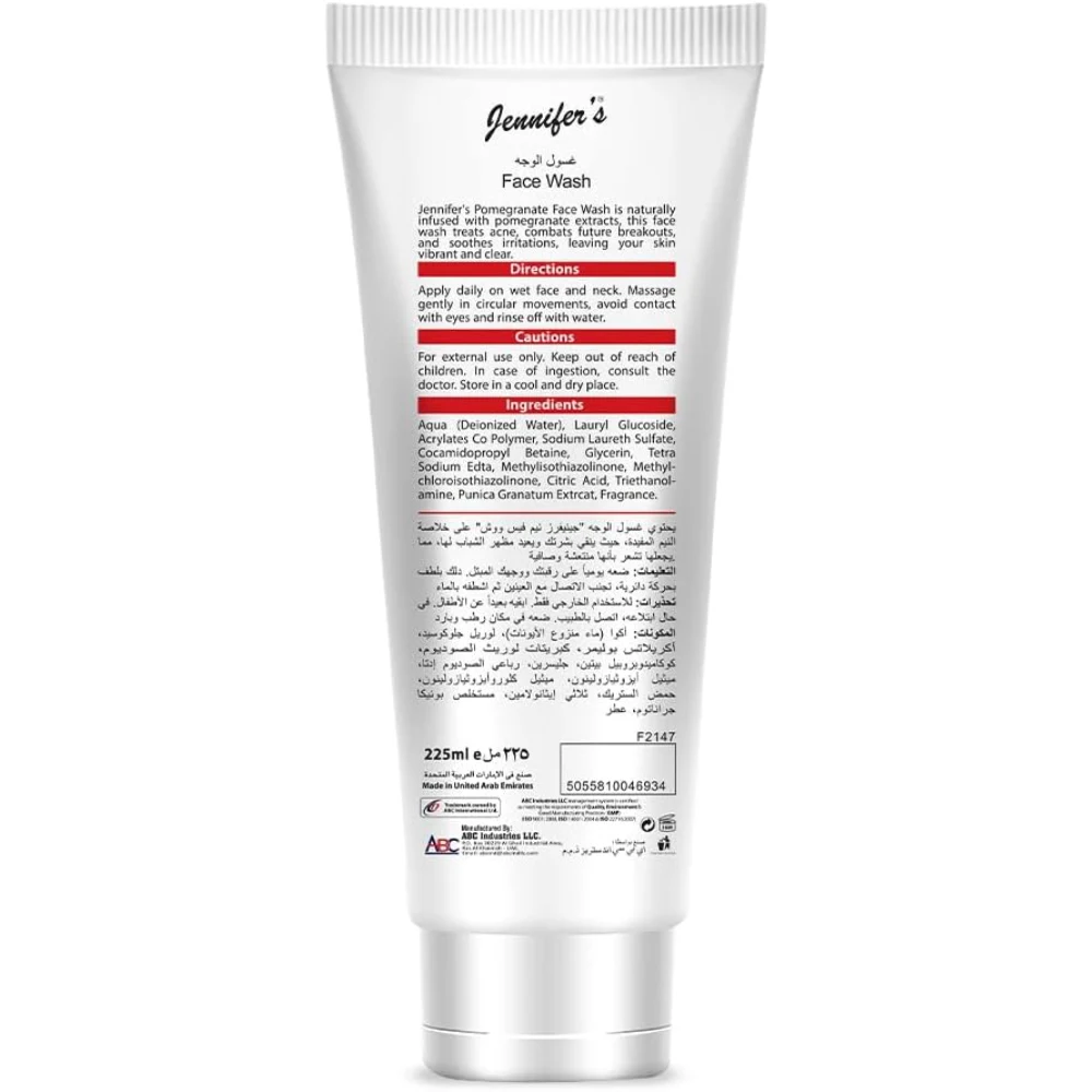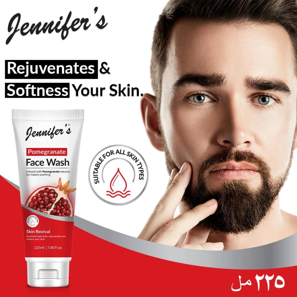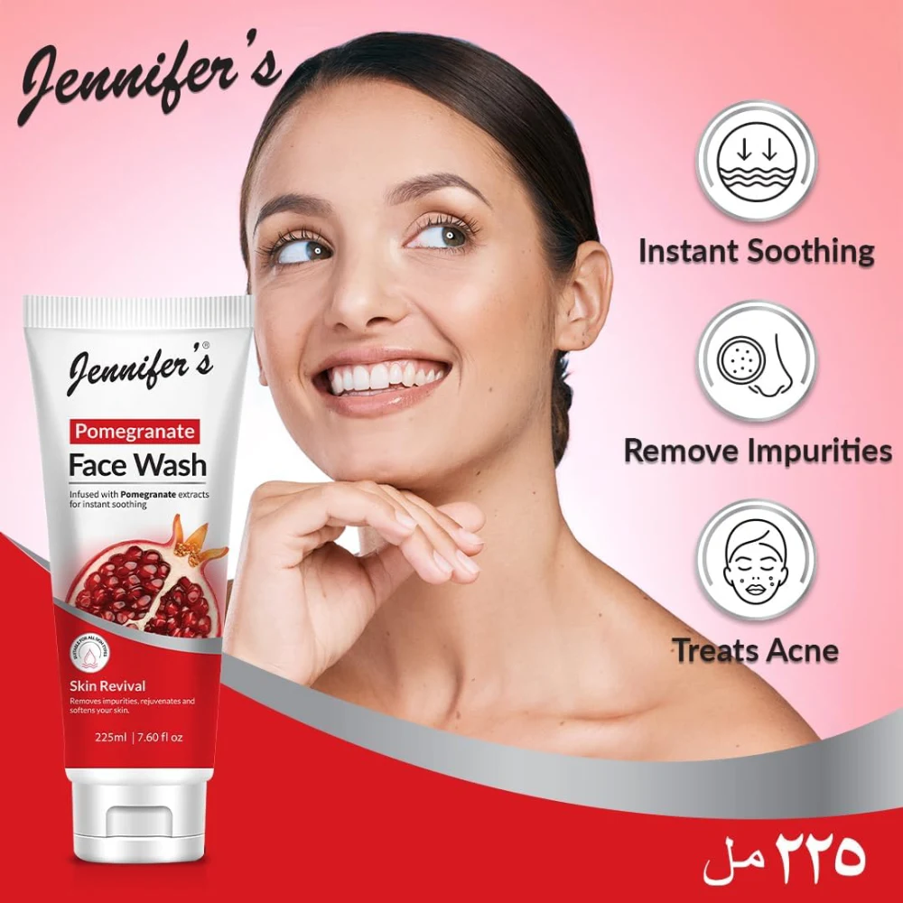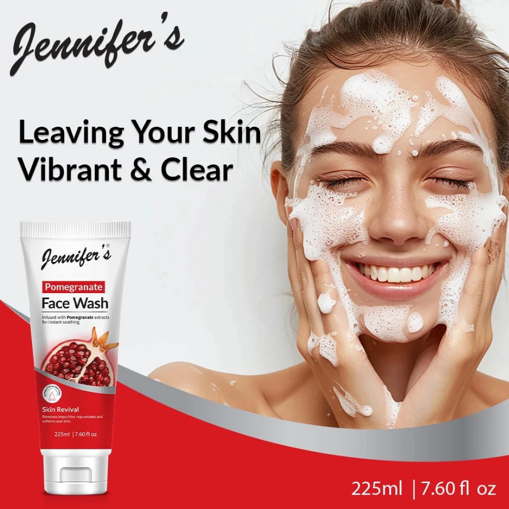 JENNIFERS POMEGRANATE FACE WASH SKIN REVIVAL REMOVES IMPURITIES, REJUVENATES AND SOFTENS YOUR SKIN 225 ML Infused with Pomegranate Extracts: Rich in antioxidants, pomegranate extracts help soothe and revitalize the skin. Removes Impurities: Effectively cleanses the skin, eliminating dirt, excess oil, and pollutants. Skin Revitalization: Helps restore the skin’s natural glow and softness, leaving it rejuvenated. Hydrating and Softening: Replenishes skin moisture and keeps it feeling smooth and supple. Suitable for All Skin Types: Gentle enough for daily use, ideal for all skin types.