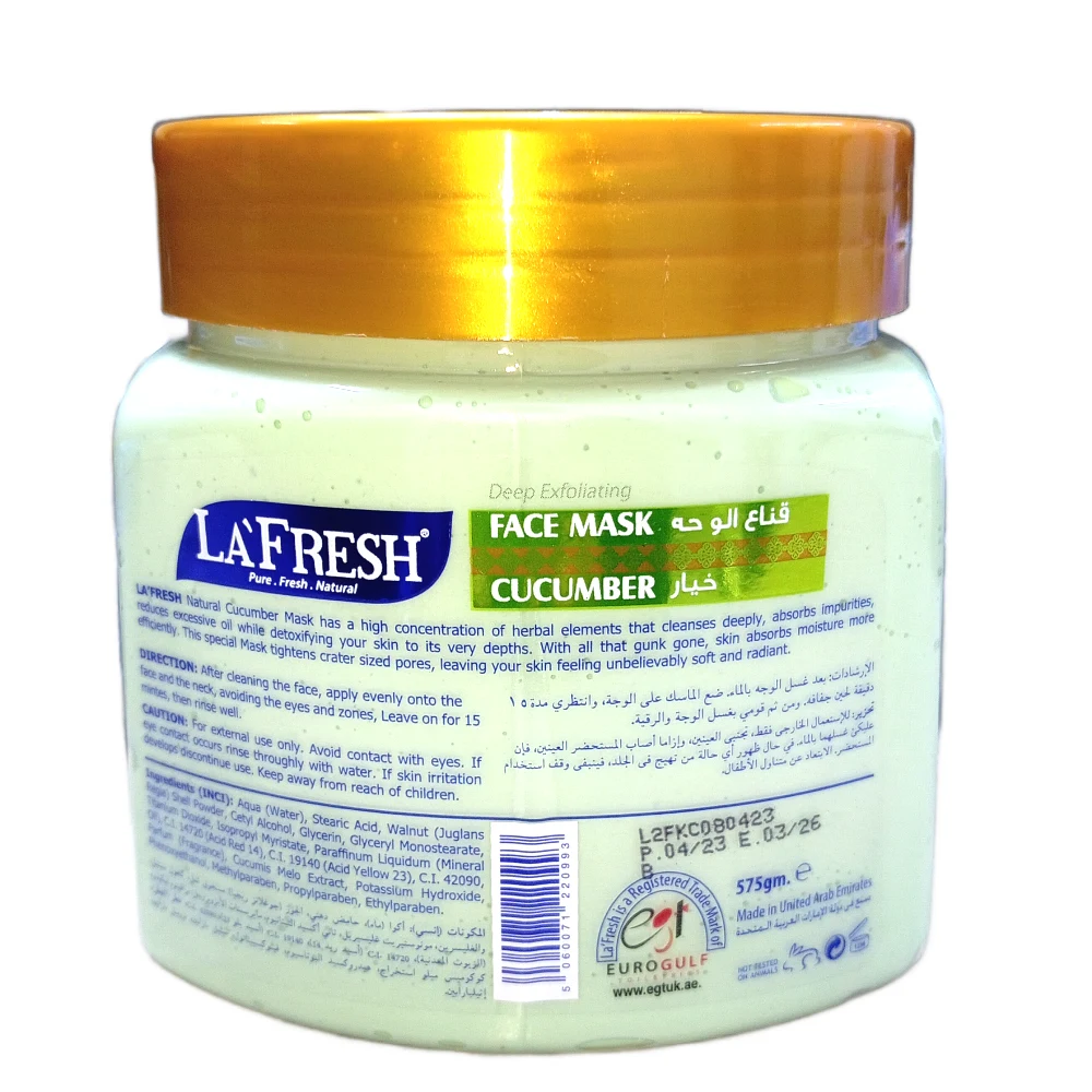 LA' FRESH DEEP EXFOLIATING CUCUMBER FACE MASK 575 G Key Features Deep Exfoliation: This face mask helps remove dead skin cells and impurities, promoting a smoother and brighter complexion. Cucumber Extract: Infused with cucumber, known for its soothing and hydrating properties, this mask can help calm the skin and reduce puffiness. Gentle Formula: Typically formulated to be gentle on the skin, making it suitable for various skin types, including sensitive skin. Hydrating: In addition to exfoliating, it often provides hydration, leaving the skin feeling soft and nourished. Easy Application: The mask usually comes in a convenient tub, making it easy to apply and store. Benefits Refreshing Sensation: The cucumber extract provides a cooling effect, making it perfect for a relaxing spa-like experience at home. Improves Skin Texture: Regular use can help improve the overall texture of the skin, making it look healthier and more radiant.
