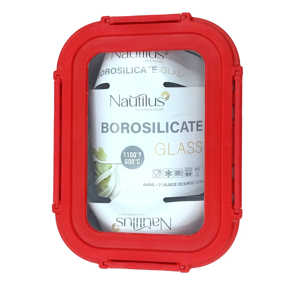 NAUTILUS BOROSILICATE FOOD CONTAINER 640ML - RED The Nautilus borosilicate food container (640ml) in red is a stylish and functional choice for food storage. Made from high-quality borosilicate glass, it is resistant to thermal shock, meaning it can withstand both hot and cold temperatures without breaking. This makes it ideal for storing leftovers, meal prep, or packing lunches. The container features an airtight lid that helps keep your food fresh and prevents spills, making it perfect for both storage and on-the-go use. The vibrant red color adds a pop of color to your kitchen or lunch bag. Additionally, it is often microwave, oven, and dishwasher safe, offering convenience for reheating and cleaning. Overall, this Nautitus container combines durability and design, making it a practical addition to your kitchenware collection.