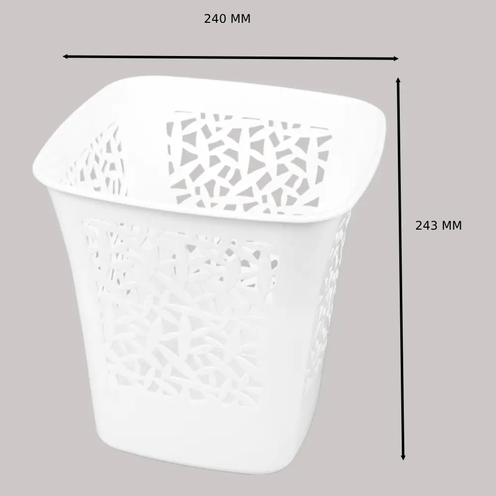 PLASTICNA FLOWER DESIGNED DUST BIN 8 L I-BK-240-WHT - WHITE The "Plasticna Flower Designed Trash Bin" has the following specifications: Capacity: 8 liters Length: 240 mm Width: 240 mm Height: 243 mm This trash bin features a decorative flower design, adding a stylish touch to your space while offering practical waste storage. It's made from durable plastic and is suitable for smaller spaces such as kitchens, bathrooms, or offices.