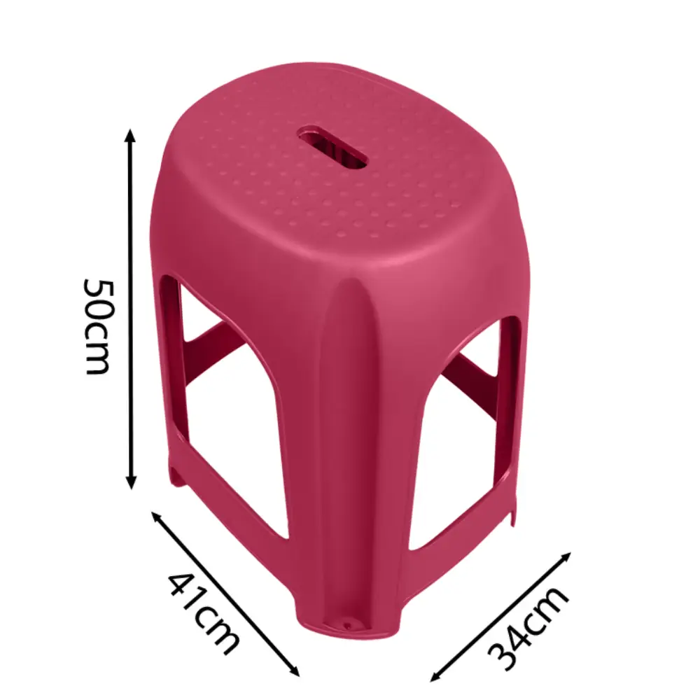 PLASTICNA LARGE STOOL I-SH-410-DRED - RED The Plasticna Large Stool has the dimensions: 50 cm (height) x 41 cm (length) x 34 cm (width). This stool is a larger, sturdy option made from durable plastic. It can be used for seating, as a footrest, or for other practical purposes in both indoor and outdoor spaces. Its size offers more comfort compared to smaller stools, while still being compact enough for easy storage.