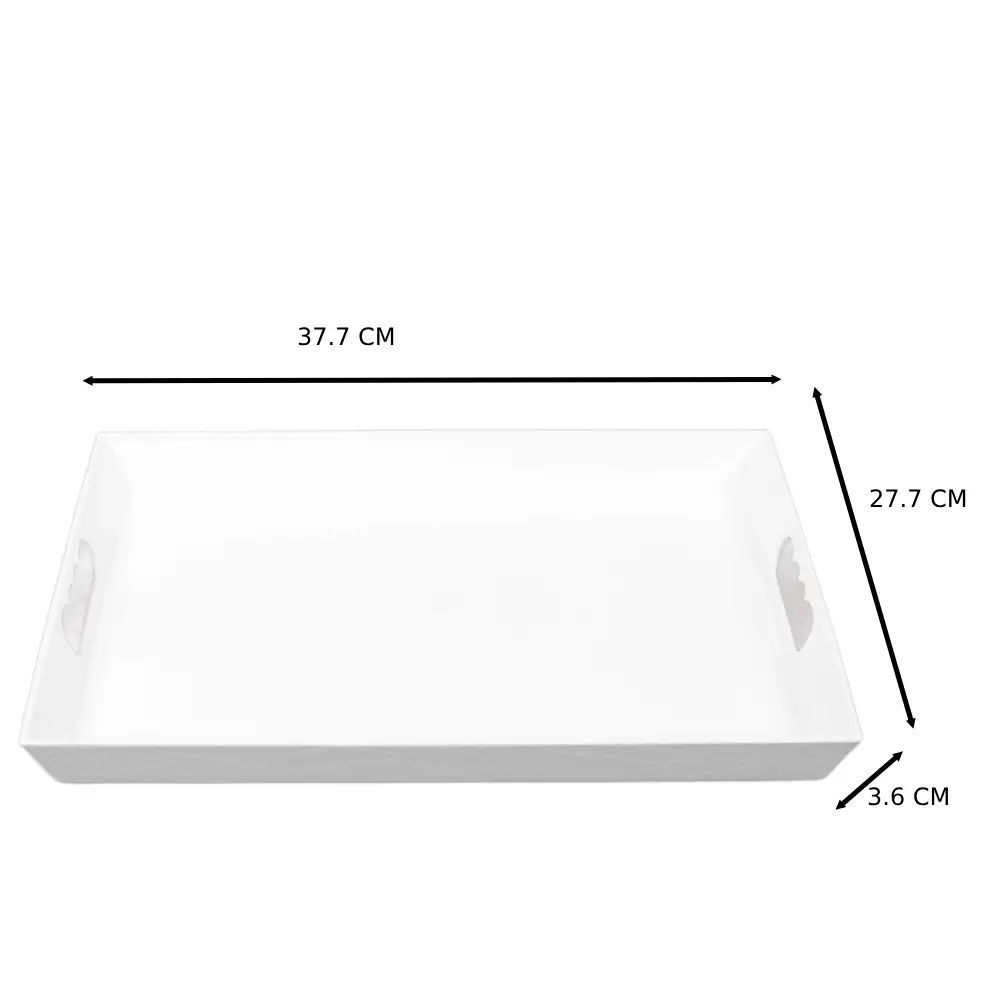 PLASTICNA LEATHER TEXTURE PLASTIC TRAY SMALL - WHITE A Plastic Leather Texture Plastic Tray (Small) with the dimensions: Length (L): 377mm Width (W): 277mm Height (H): 36mm This tray would have a plastic construction with a leather-like texture, giving it an elegant and sophisticated look. The dimensions make it ideal for smaller serving tasks or organizing items in a stylish way. Here's a breakdown of what to expect: Key Features: Material: Plastic with a leather texture finish. The texture simulates leather’s tactile quality while maintaining the lightweight and easy-to-clean benefits of plastic. Color: Likely in neutral tones (such as beige, brown, or black), which enhance its leather-like appearance and offer versatility for various décor styles. Size: The tray's 377mm length and 277mm width provide a functional size for smaller servings, such as tea or coffee cups, or for organizing smaller items like keys or accessories.