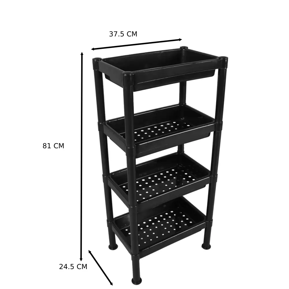 PLASTICNA SMALL SHELF RACK 4 LAYER - BLACK The Plastic Small Shelf Rack with 4 layers has the following specifications: Material: Plastic Layers: 4 Dimensions: Length: 375 mm Width: 245 mm Height: 810 mm This compact 4-layer rack is perfect for organizing small items in tight spaces. It's ideal for use in kitchens, bathrooms, or any other area where you need to save space and maintain organization.