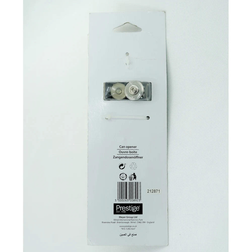 PRESTIGE CAN OPENER The Prestige Can Opener is a reliable and efficient kitchen tool designed to make opening cans a breeze. Crafted from high-quality materials, this can opener features a sharp cutting wheel that easily punctures and cuts through metal lids, providing a smooth and safe opening. Its ergonomic handle is designed for comfort, ensuring a secure grip while in use. The can opener typically includes a built-in safety feature to prevent sharp edges from posing a hazard after the can is opened. This design enhances user safety and makes it easy to dispose of lids without any risk of cuts. Compact and easy to store, the Prestige Can Opener is an essential addition to any kitchen, whether you're preparing meals or opening canned goods for quick snacks. With its durability and ease of use, it simplifies kitchen tasks and enhances your cooking experience!