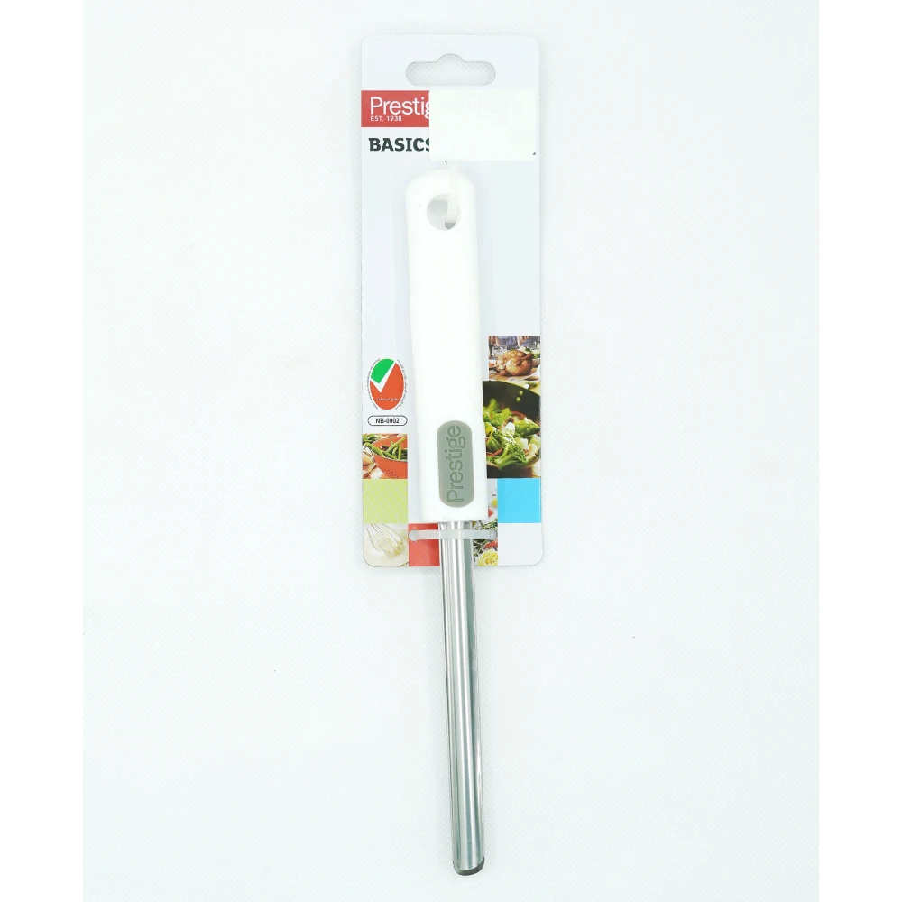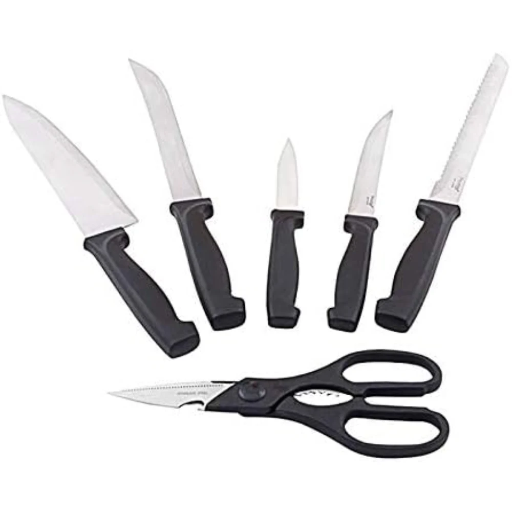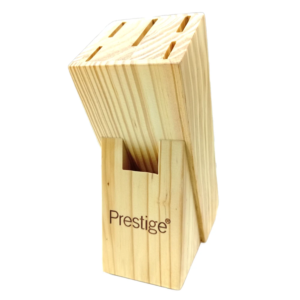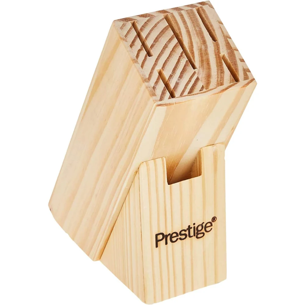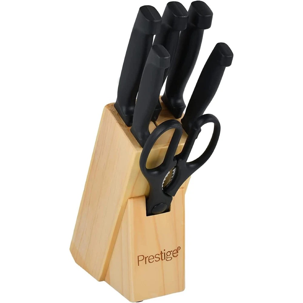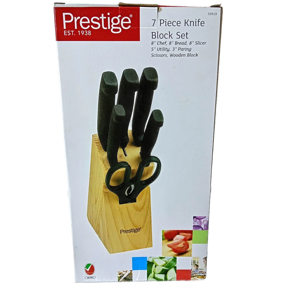 PRESTIGE KNIFE SET WITH WOODEN BLOCK 7 PIECES 8" Chef's Knife: A versatile, all-purpose knife for chopping, slicing, and dicing vegetables, meat, and more. 8" Bread Knife: Serrated blade designed for cutting through crusty bread without crushing it. 8" Slicer: Ideal for slicing large cuts of meat, roasts, or poultry. 5" Utility Knife: A smaller, versatile knife for various kitchen tasks like cutting fruits, vegetables, and meats. 3" Paring Knife: A small knife used for detailed tasks such as peeling, coring, and trimming. Scissors: Multipurpose kitchen scissors for cutting herbs, opening packages, or other tasks. Wooden Block: A wooden storage block to organize and safely store your knives. Key Features: Stainless Steel Blades: High-quality blades that are sharp, durable, and resistant to rust. Wooden Handles: Ergonomic handles for a comfortable grip, offering a traditional look and feel. Wooden Block Storage: Keeps the knives organized, protected, and easily accessible on your countertop.