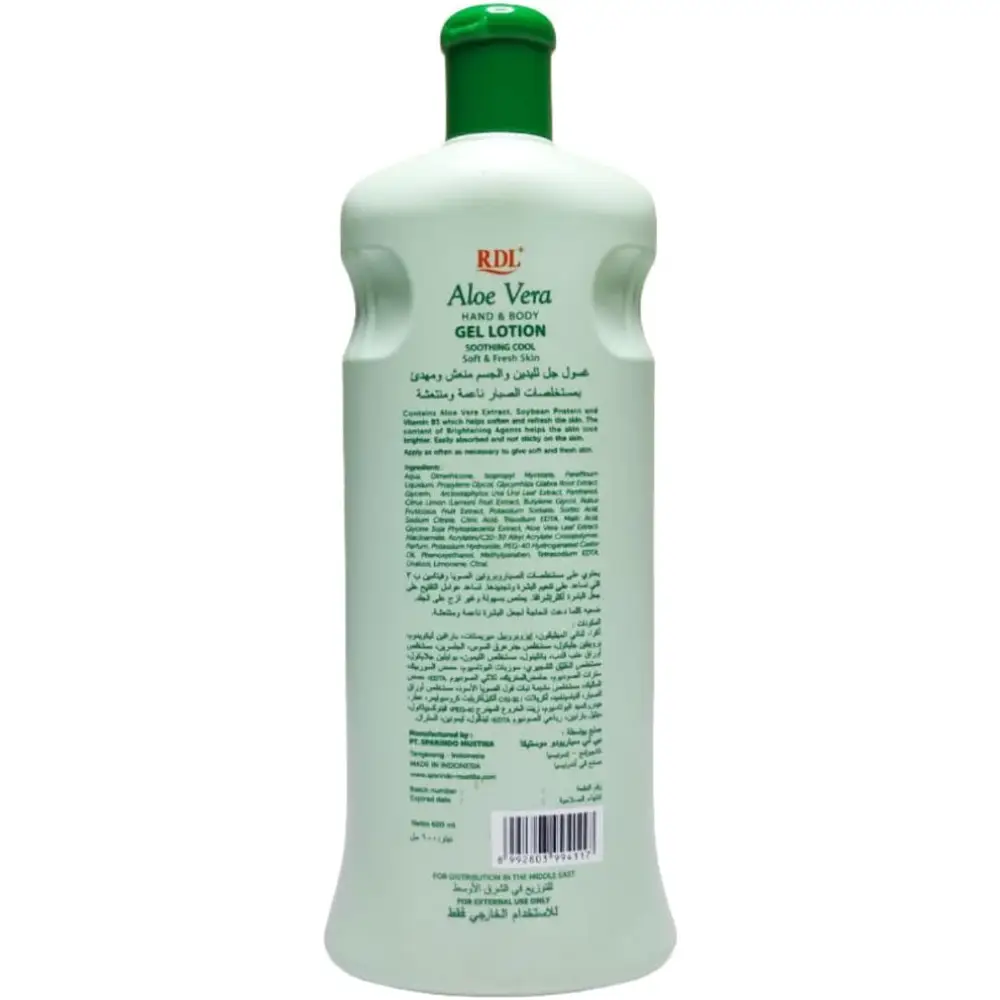 RDL EXTRACT ALOE VERA HAND & BODY LOTION FOR SOFT & FRESH SKIN 600 ML Main Ingredient: Aloe Vera Extract Skin Benefits: Known for soothing, cooling, and hydrating properties Primary Function: Moisturises skin to prevent dryness Effect on Skin: Keeps skin soft, smooth, and fresh all day Texture: Lightweight, absorbs easily, non-sticky feel Daily Use: Gentle enough for regular application on hands and body Skin Type: Suitable for normal to dry skin Aloe Vera Role: Helps calm irritation, refresh tired skin, and maintain natural glow Result: Healthy-looking, nourished, and refreshed skin Packaging: Large 600 ml bottle, practical for family or long-term use