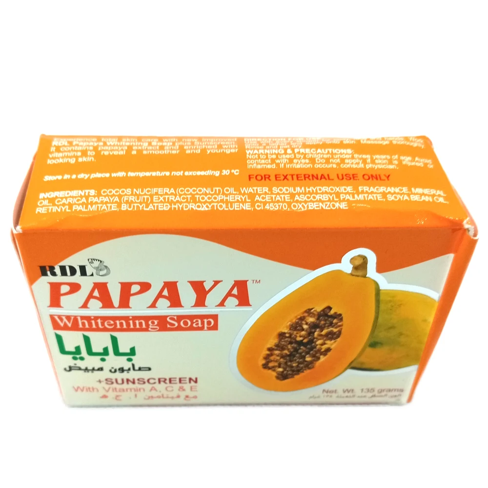 RDL PAPAYA WHITENING BATH SOAP + SUNSCREEN WITH VITAMIN A,C & E 135 G RDL Papaya Whitening Bath Soap with Sunscreen (135 g) is formulated to promote brighter skin while providing protection from sun damage. Here are some key features: Key Ingredients: Papaya Extract: Known for its natural exfoliating properties, it helps remove dead skin cells and brighten the complexion. Vitamins A, C, and E: These vitamins provide antioxidant benefits, nourish the skin, and support overall skin health. Sunscreen: Helps protect the skin from harmful UV rays, reducing the risk of sun damage and darkening. Benefits: Whitening: Aims to lighten dark spots and promote an even skin tone. Sun Protection: Provides a layer of defense against sun exposure, which is crucial for maintaining skin brightness. Moisturizing: Helps to keep the skin hydrated and smooth. Use: Ideal for daily use on both the body and face, this soap helps leave skin feeling clean, refreshed, and protected.
