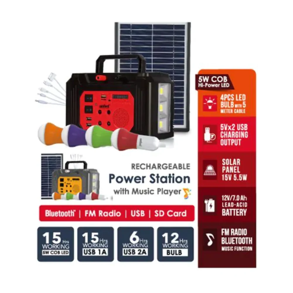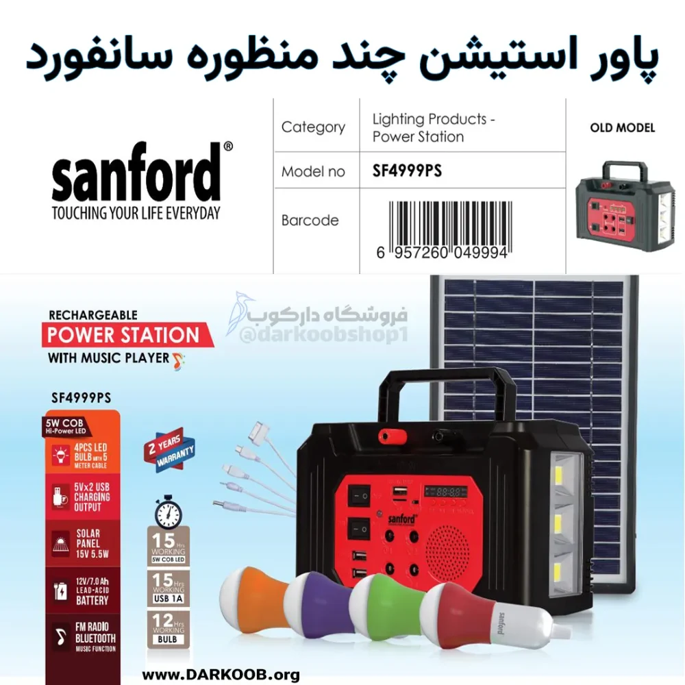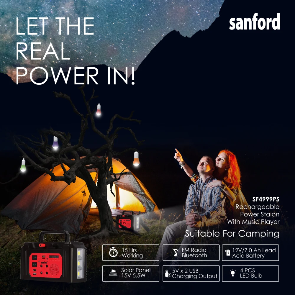 SANFORD SF4999PS RECHARGEABLE POWER STATION WITH MUSIC PLAYER 18 WATTS The power station is equipped with a 7000mAh battery, which can store a significant amount of energy, making it suitable for charging small electronic devices (such as mobile phones, tablets, or cameras) or running low-power appliances for extended periods. With its 12V output, it can provide reliable power for a variety of devices, making it ideal for outdoor activities, camping, emergencies, or even home backup power when needed. Music Player (18W): One of the standout features of this power station is the built-in music player. It offers 18 watts of output, allowing you to play your favorite tunes while you're on the go. Whether you're enjoying a day at the beach, a camping trip, or a picnic, you can enjoy music powered by the same device that charges your gadgets. It might support various audio inputs, such as Bluetooth, USB, or SD card, allowing you to play music from your phone or external media 5W COB LED Light: This power station features a 5W COB LED light, which provides powerful high-brightness lighting. It's especially useful in low-light conditions, whether you're camping at night or need a backup light during power outages. The COB (Chip On Board) LED technology provides higher brightness and energy efficiency compared to traditional LEDs, giving you a bright and lasting light source. 15V 5.5W Solar Panel: The inclusion of a 5.5W solar panel makes this power station solar rechargeable, allowing you to charge it during the day, especially when you're outdoors and away from an electrical outlet. The 15V output ensures that the solar panel provides enough power to recharge the unit effectively. This feature is ideal for sustainable, off-grid energy use, providing you with a renewable power source, making it great for camping trips, hiking, or road trips. 5-Head Charging Cable: The 5-head charging cable comes included, allowing you to connect and charge multiple devices at the same time. It is compatible with a variety of devices, including smartphones, tablets, and more. The cable offers multiple connectors for different devices, which adds to the versatility of the power station. USB Charging Ports (5V x 2): The power station is equipped with 2 USB charging ports (5V each), enabling you to charge two devices simultaneously. Whether you need to charge your smartphone, tablet, or other USB-powered devices, these ports ensure you have enough options for your charging needs. Compact and Portable: Despite its powerful features, the Sanford SF4999PS Power Station is designed to be compact and lightweight, making it easy to carry and store. It’s perfect for on-the-go use, whether you're headed outdoors, need it in case of an emergency, or want to keep it in your car as a backup power source. Multi-functional: With its combination of a power station, music player, LED light, and solar panel charging, this device is a multi-functional solution for various scenarios, such as camping, road trips, outdoor events, or emergency situations where access to electricity is limited. How to Use: Charging the Power Station: You can charge the power station using either an electrical outlet, the built-in solar panel (when outdoors), or via a vehicle charger if you’re on the road. The solar panel will take longer to fully charge the unit compared to a regular outlet but provides a great way to keep the device topped up when you're off-grid. Using the Music Player: Pair your device with the Bluetooth function or insert an SD card or USB drive with your music files to start playing tunes. Adjust the volume and settings via the power station controls.