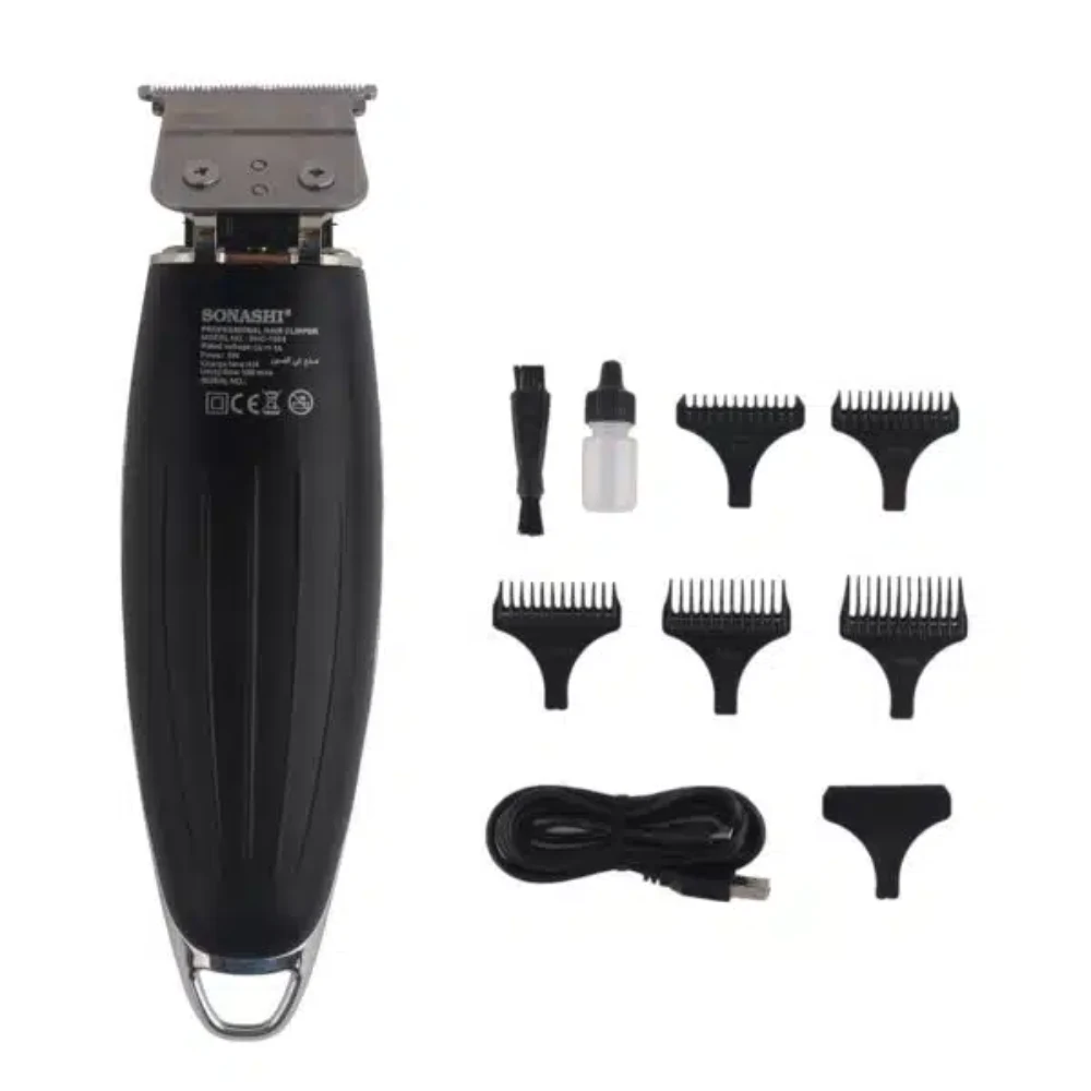 SONASHI HAIR CLIPPER SHC1054 T-Type Sharp & Durable Steel Cutter Blade Charging Time: 4 hours Continuous Working Time: 3 hours Charging Indicator Light USB Charging Lithium Battery: 2000mAh Included Accessories: 1 cleaning brush, 5 combs, oil bottle, USB cable Voltage: 5V, 1A, 5W