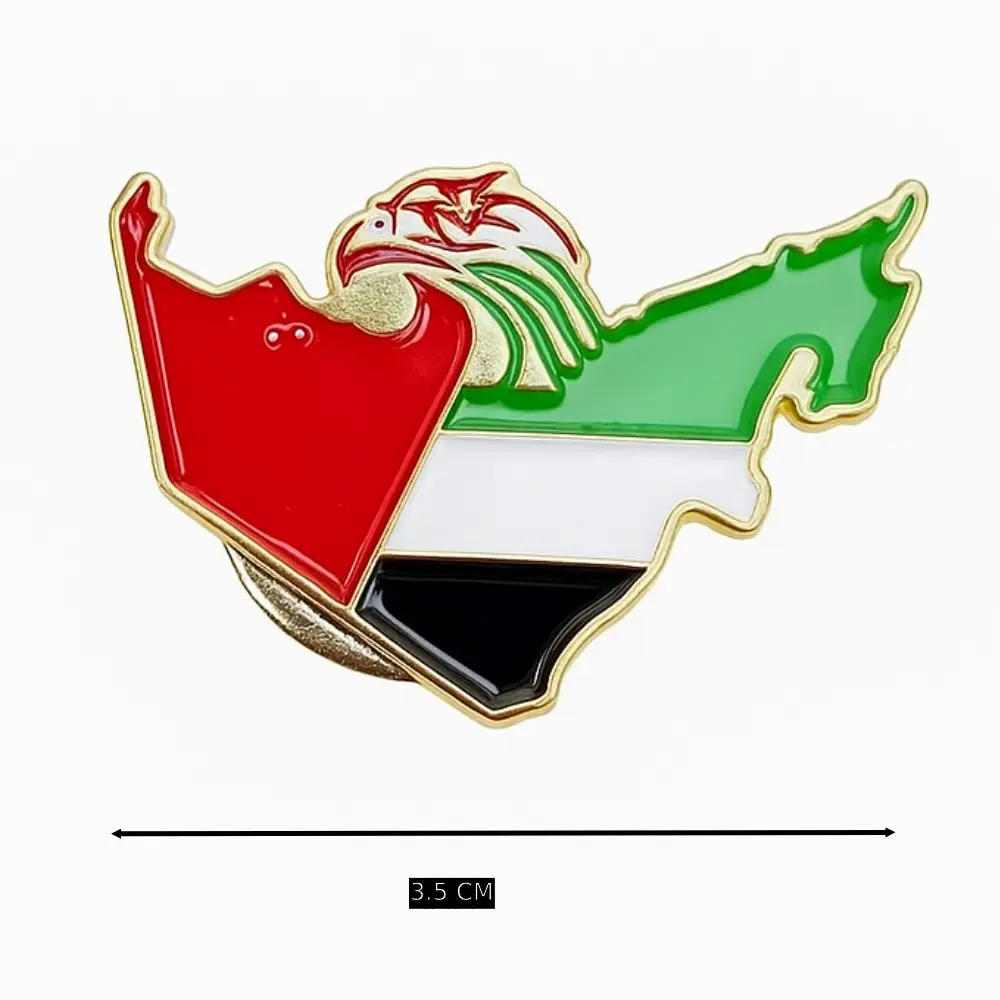UAE NATIONAL DAY FALCON UAE MAP BADGE WITH MAGNET The UAE National Day Falcon UAE Map Badge with Magnet is a small metal badge showing the falcon and UAE map design. It represents national pride, strength, and unity of the seven emirates. The badge is usually decorated in UAE flag colours for the National Day celebration. It comes with a magnet back, so it can be worn without damaging clothes. People wear it on shirts, jackets, or bags to show love for the country.