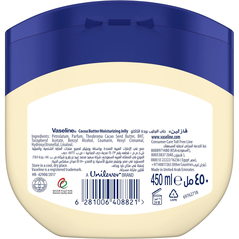 VASELINE PETROLEUM JELLY COCOA BUTTER MOISTURIZING JELLY 450ML Crafted with petroleum jelly, our triple-purified formula ensures purity and effectively heals dry, damaged, or dull skin. Our Moisturizing Jelly features signature Vaseline Petroleum Jelly, which locks in moisture and protects against dryness. Dermatologically tested, hypoallergenic, and non-comedogenic, the Vaseline Petroleum Jelly formula is suitable for sensitive, cracked skin and won’t clog pores. Enriched with cocoa butter, it nourishes your skin, keeping it healthy and radiant all day. Vaseline moisturizer promotes healthy-looking, naturally glowing skin while leaving a subtle cocoa fragrance. Experience soft, healthy skin with this petroleum jelly-infused skincare product, clinically proven to heal dry or damaged skin.