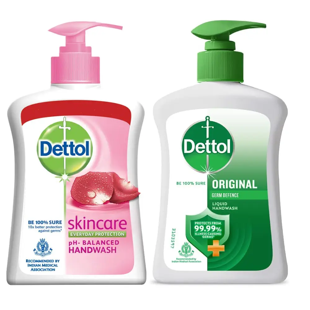 DETTOL LIQUID SOAP HAND WASH ORIGINAL & SKIN CARE - 210 ML X 4 This is a set of two liquid hand wash bottles, each 210 ml. Original: Provides normal daily hand protection and removes germs while keeping hands clean. Skin Care: Made for gentle use; helps keep hands soft and moisturized while cleaning. Both are used by applying one pump, rubbing with water, and rinsing. Suitable for use in kitchen, bathroom, or wash area.