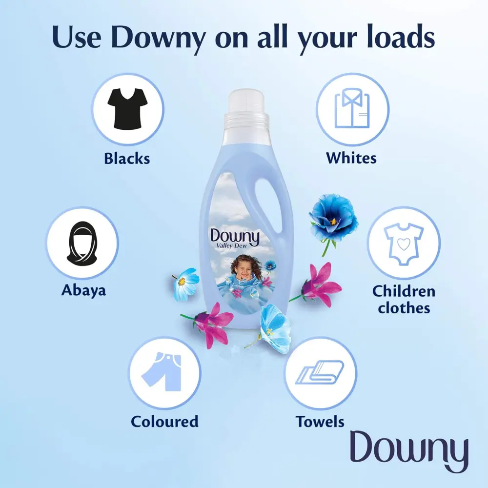 DOWNY VALLEY DEW BLUE REGULAR FABRIC SOFTENER 2 L This is a liquid fabric softener used after washing clothes. It helps make clothes feel softer and smoother. Leaves a light fresh “cool breeze” type fragrance on fabrics. Helps reduce wrinkles and makes ironing easier. Suitable for everyday clothes, towels, and bed sheets.