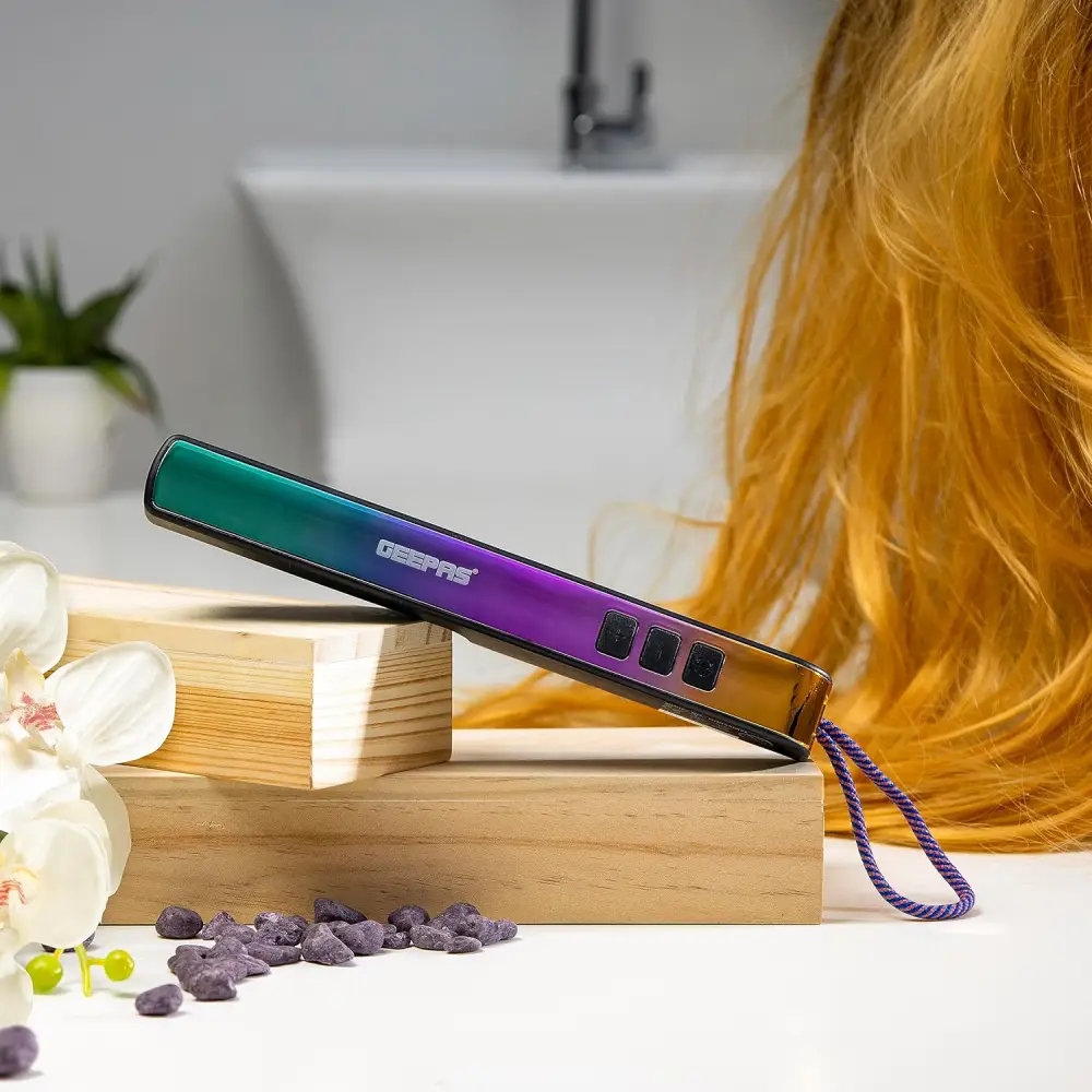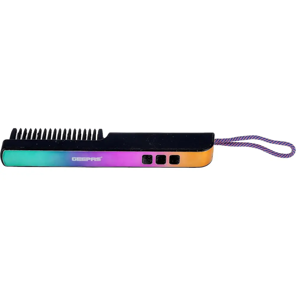 GEEPAS HAIR BRUSH GHBS86056 A rechargeable hair brush with ceramic-coated bristles that glide smoothly through your hair for naturally looking hair. The hair brush has a slim design with long, professional ceramic-coated plates measuring 89x11 mm and is easy to use. The heating rate is 200 degrees Celsius per five minutes, with a charging time of 1.5 to 2 hours and a usage time of more than 25 minutes. The inbuilt light indicator indicates the charge level; it lights red when charging and green when fully charged. The digital temperature control helps to control the temperature that suits your hair type. The hair brush can be charged via USB cable, and it comes with a carry pouch