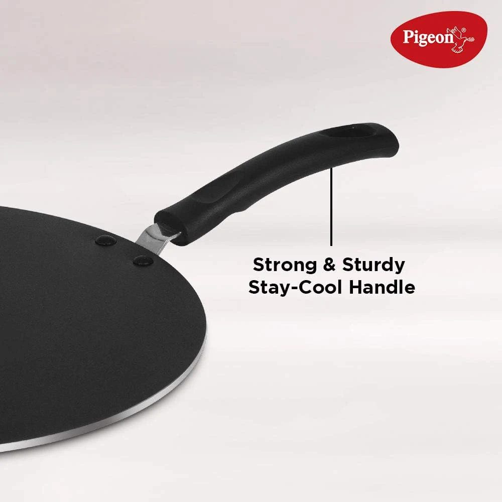 PIGEON NON-STICK TAWA 30 CM The Pigeon Non-Stick Tawa (30 cm) is an excellent kitchen tool for making a variety of flatbreads and other dishes. Here are its key features and benefits: Key Features: Non-Stick Coating: The high-quality non-stick surface ensures easy food release, allowing you to cook with minimal oil and facilitating hassle-free cleanup. Generous Size: At 30 cm, it provides ample cooking space for making larger flatbreads like chapatis, dosas, and pancakes, as well as for sautéing vegetables. Durable Construction: Designed to withstand regular use, the tawa is typically made from sturdy materials that promote longevity. Even Heat Distribution: The tawa is crafted to distribute heat evenly, ensuring consistent cooking results without hot spots. Comfortable Handle: Equipped with an ergonomic handle, it offers a secure grip for safe handling while cooking. Versatile Use: Besides flatbreads, it can also be used for frying and grilling, making it a multifunctional kitchen tool.