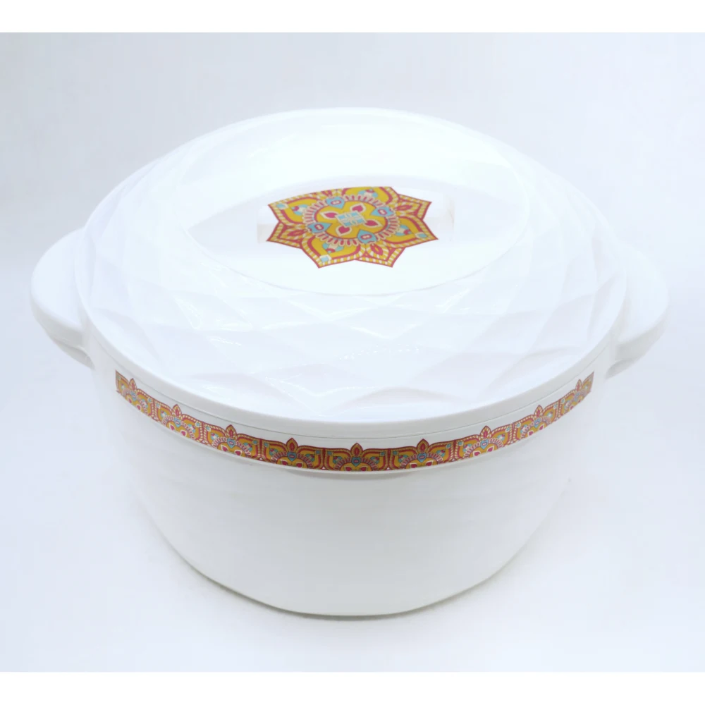RISHABH DINING HOT POT 6000 ML The Rishabh Dining Hot Pot with a capacity of 6000 ml is designed for serving large meals, making it perfect for family gatherings or special occasions. Here are some typical features: Material: Often made from high-quality stainless steel or durable food-grade materials, ensuring longevity and easy maintenance. Capacity: The 6000 ml size allows for generous portions, ideal for curries, stews, rice, and other dishes. Insulation: Many models feature insulated construction to keep food hot for extended periods. Lid: Typically comes with a tight-fitting lid that helps retain heat and moisture, preventing spills and enhancing flavor. Design: Usually designed to be both functional and visually appealing, making it suitable for serving directly at the table. Handles: Equipped with sturdy, heat-resistant handles for easy transport and serving.
