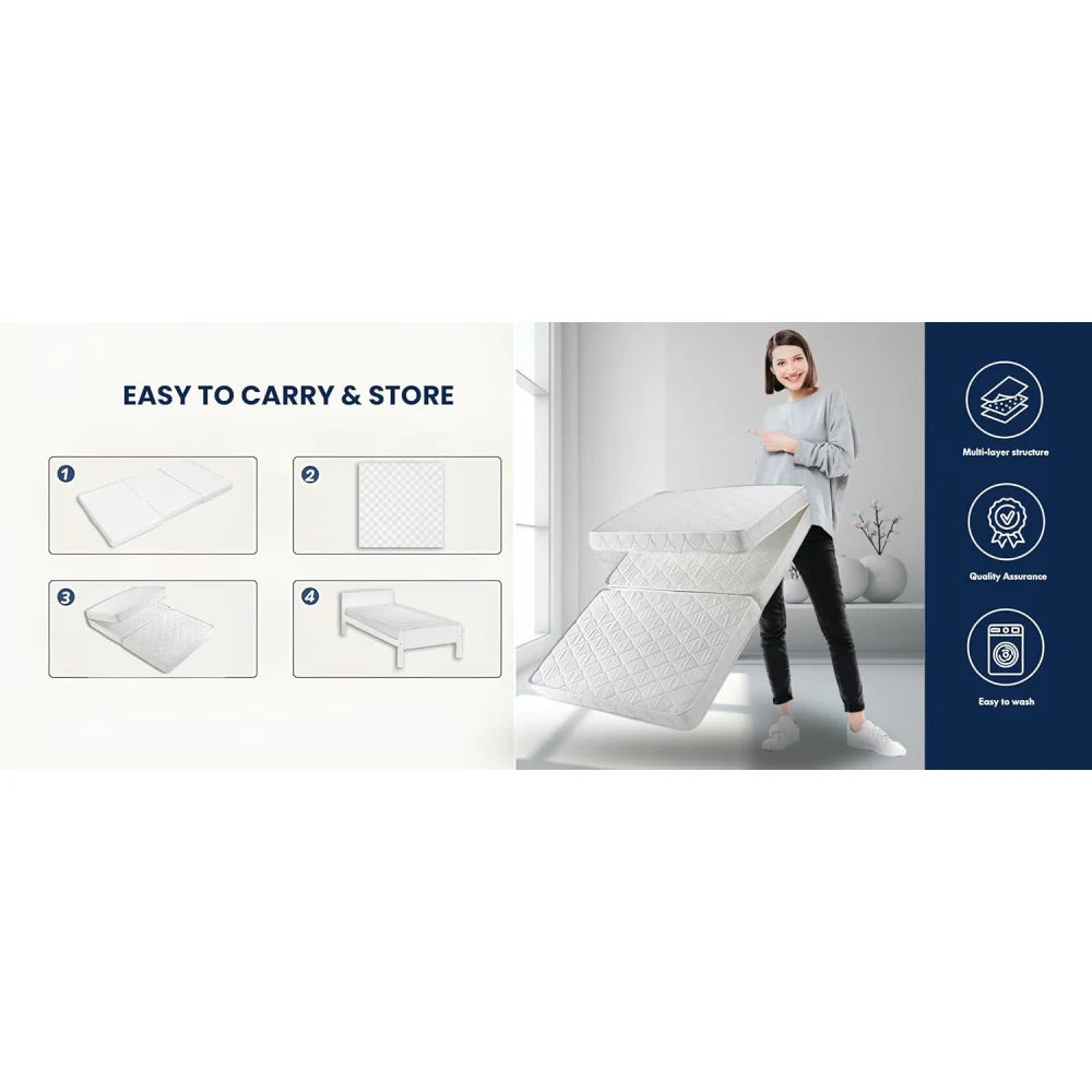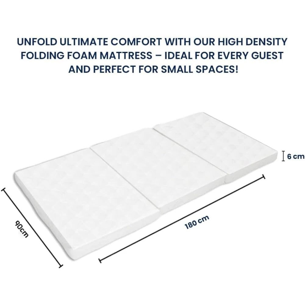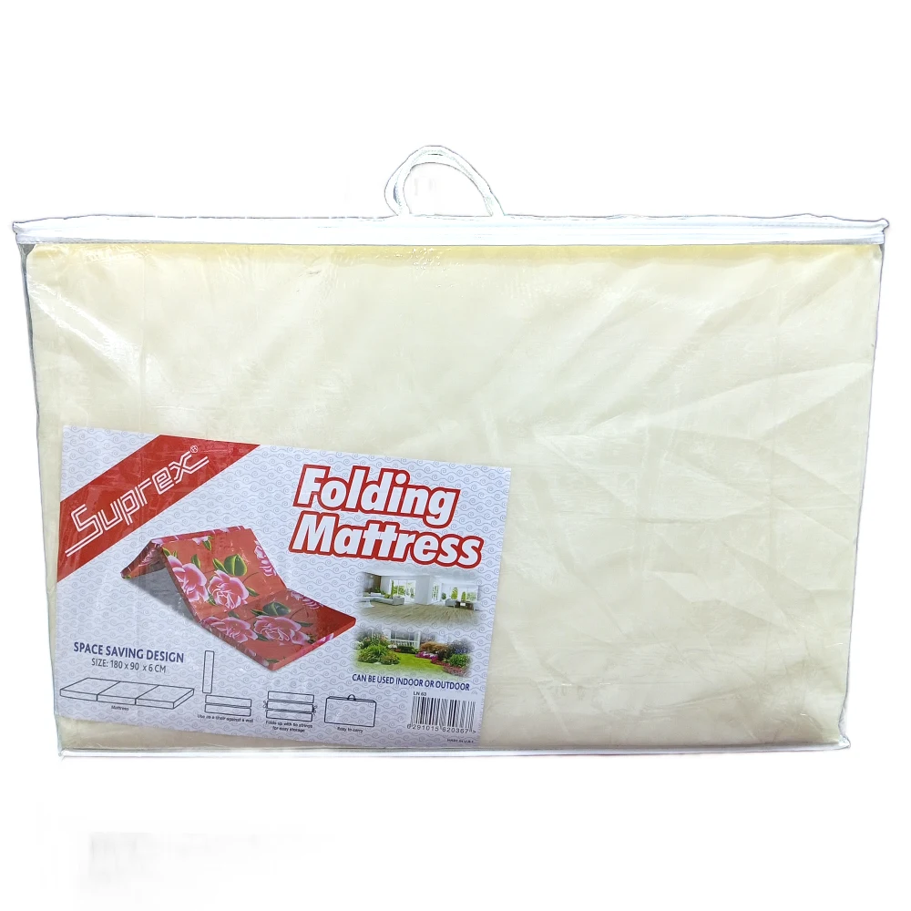 SUPREX SPACE SAVING DESIGN FOLDING MATTRESS FOR INDOOR & OUTDOOR Convenient Size: Suprex Folding Mattress measures 180cm x 90cm x 6cm, suitable for all ages. Ensures durability and quality with its memory foam construction. Tri-Fold Design: Includes three folds for versatile use - ideal for camping, guest beds, and various activities. Encourages skill development and suits all skill levels and age ranges. Quality Material: Crafted with exceptional comfort. Suitable for various conditions, perfect for camping, guest beds, and provides lasting comfort to diverse audiences. User-Friendly Applications: Easy to maintain, featuring a washable cover and a unique folding design. Solves various user applications and is perfect for multiple keywords. Versatile Benefits: Delivers comfort, support, and convenience for different audiences. Tailored Comfort: Customizable comfort and benefits to cater to specific audience needs. Perfect for guests, camping, or as a temporary sleeping solution
