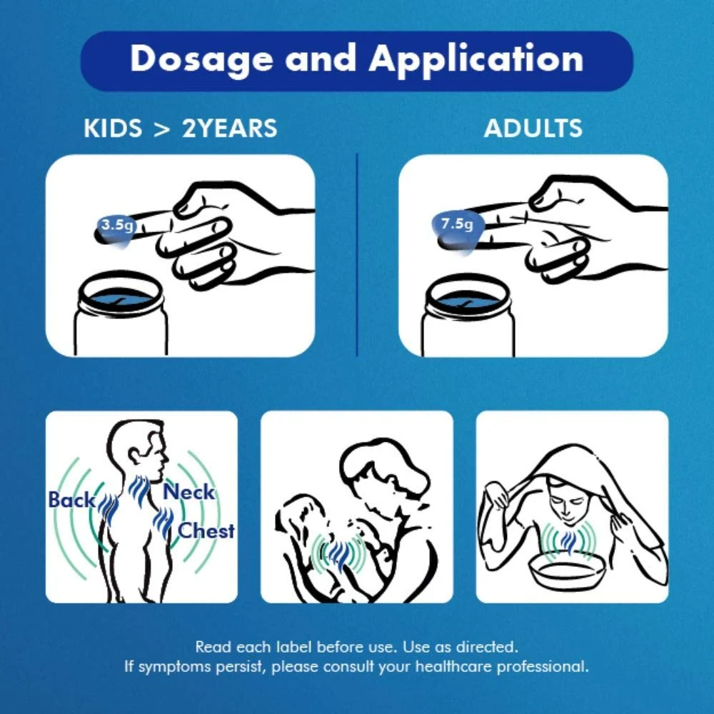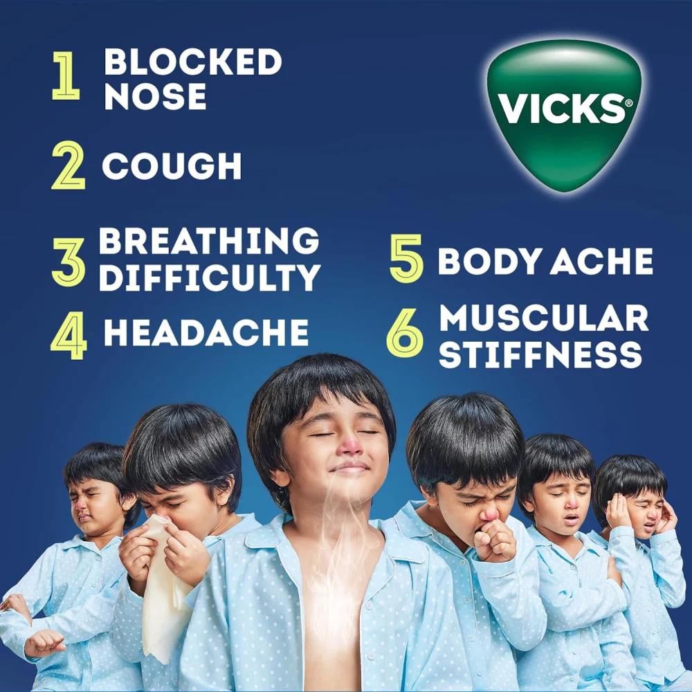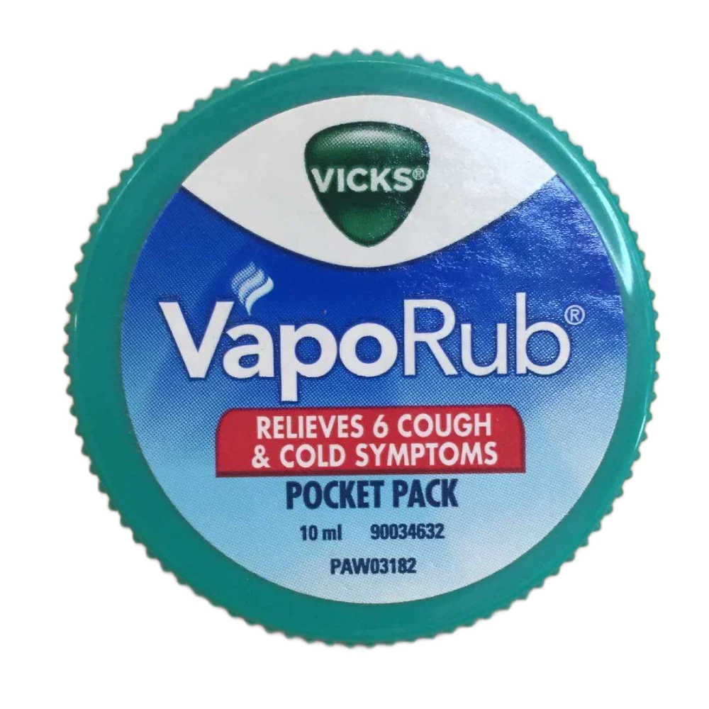 VICKS VAPORUB RELIEVES 6 COUGH & COLD SYMPTOMS 10 ML Multi-Symptom Relief: Targets six symptoms, including cough, nasal congestion, sore throat, and muscle aches. Active Ingredients: Contains menthol, camphor, and eucalyptus oil, which provide soothing and cooling effects. Uses: Cough Relief: Helps alleviate throat irritation and reduce coughing. Nasal Congestion: Provides relief from a stuffy nose for easier breathing. Muscle Aches: Can be applied to sore muscles for temporary pain relief. Application Instructions: Topical Use: Apply a small amount to the chest and throat for respiratory relief. For Muscle Pain: Rub it onto sore muscles as needed. Frequency: Can be used several times a day, as required. Precautions: Avoid in Young Children: Not recommended for children under 2 years; consult a healthcare provider for use in younger kids. Avoid Eyes and Sensitive Areas: Do not apply near the eyes or mucous membranes. Discontinue if Irritated: If skin irritation occurs, stop using the product.