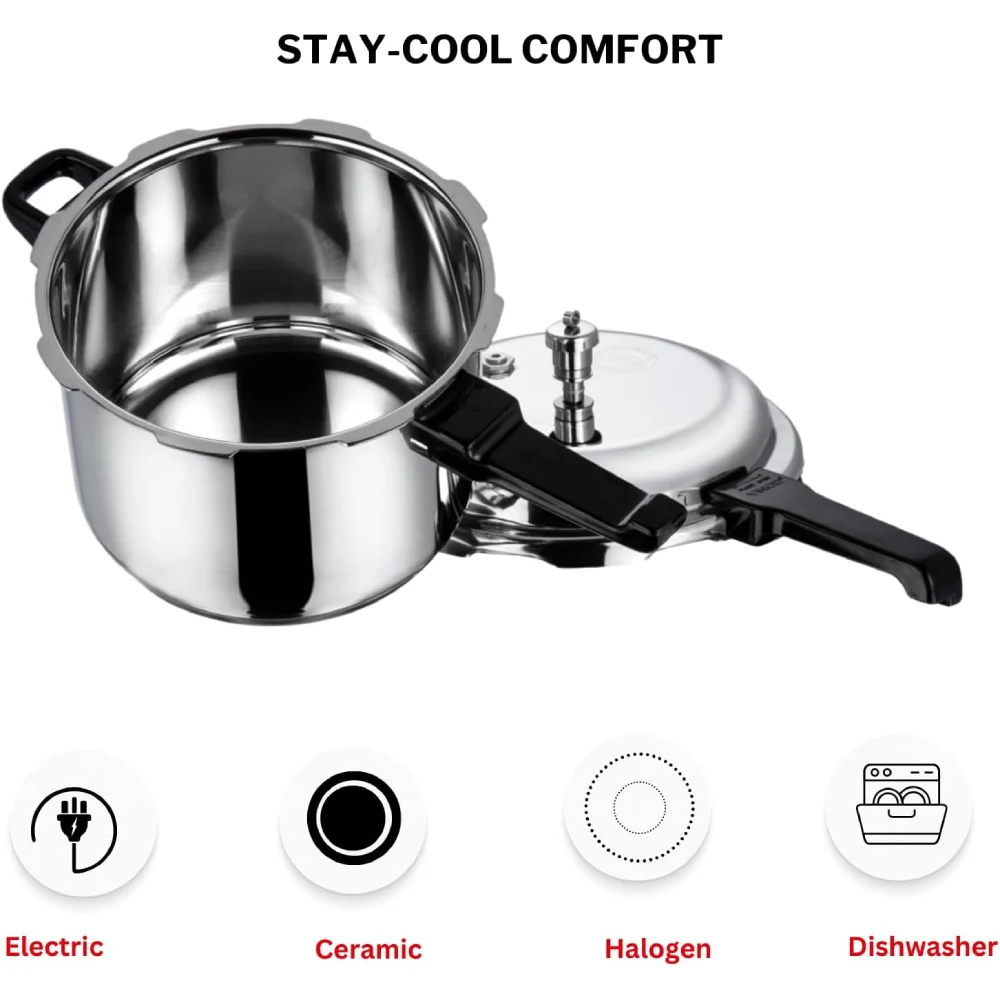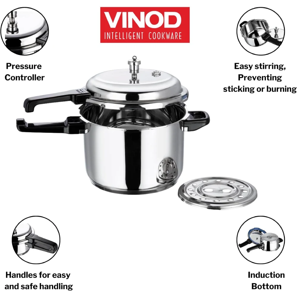 VINOD 18/8 STAINLESS STEEL SANDWICH BOTTOM PRESSURE COOKER 10 L The Vinod 18/8 Stainless Steel Sandwich Bottom Pressure Cooker (10 L) is a robust and efficient kitchen appliance designed for large-scale cooking. Here are the key features and details: Capacity: With a generous 10-liter capacity, it's perfect for large families or meal prepping for gatherings. Material: Made from high-quality 18/8 stainless steel, known for its durability and resistance to rust and corrosion. Sandwich Bottom: The sandwich bottom design allows for even heat distribution, preventing food from sticking and ensuring consistent cooking. Safety Features: Typically includes a pressure release valve and strong, heat-resistant handles for safe operation. Versatile Use: Suitable for various cooking methods, including pressure cooking, boiling, and steaming. Time-Saving: Significantly reduces cooking time compared to traditional cooking methods. Energy Efficient: Cooks food quickly, helping to conserve energy.