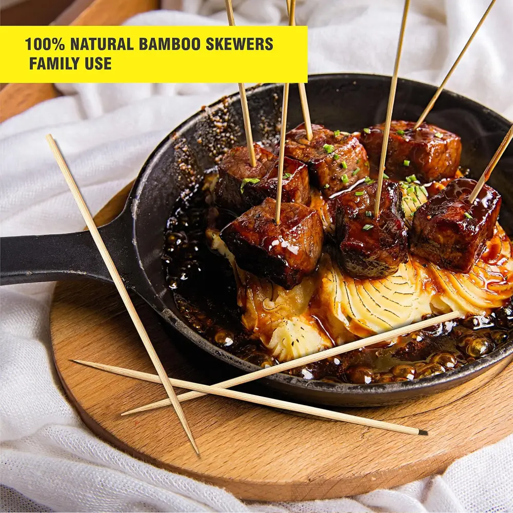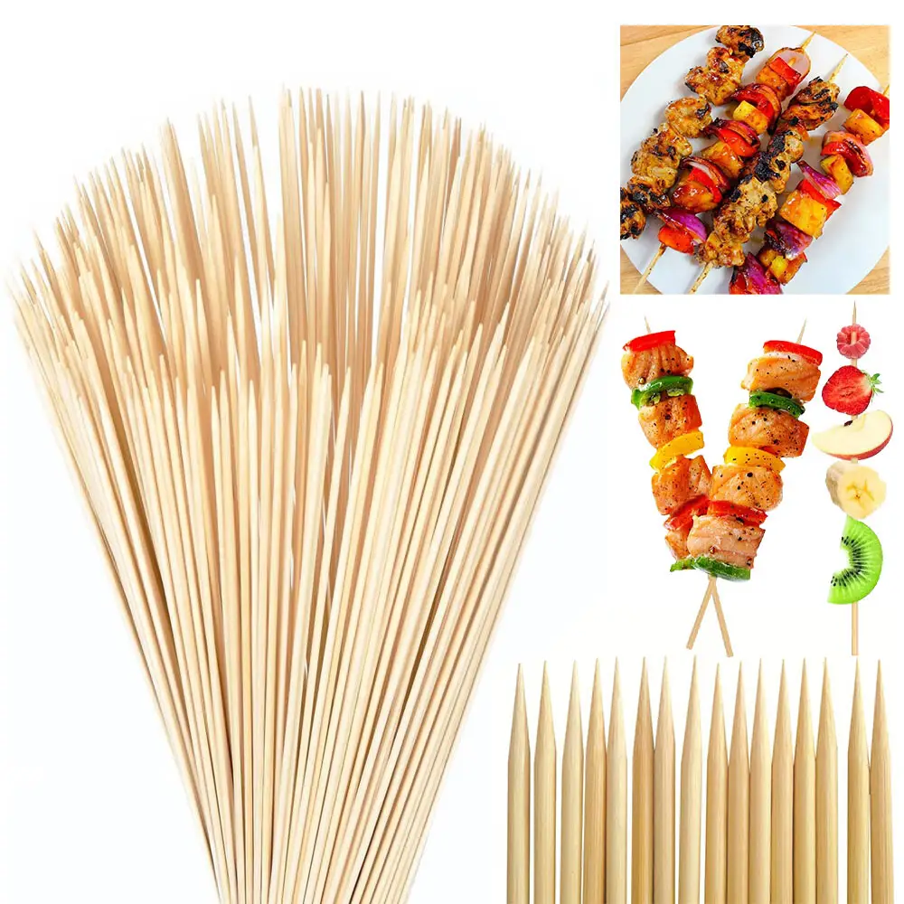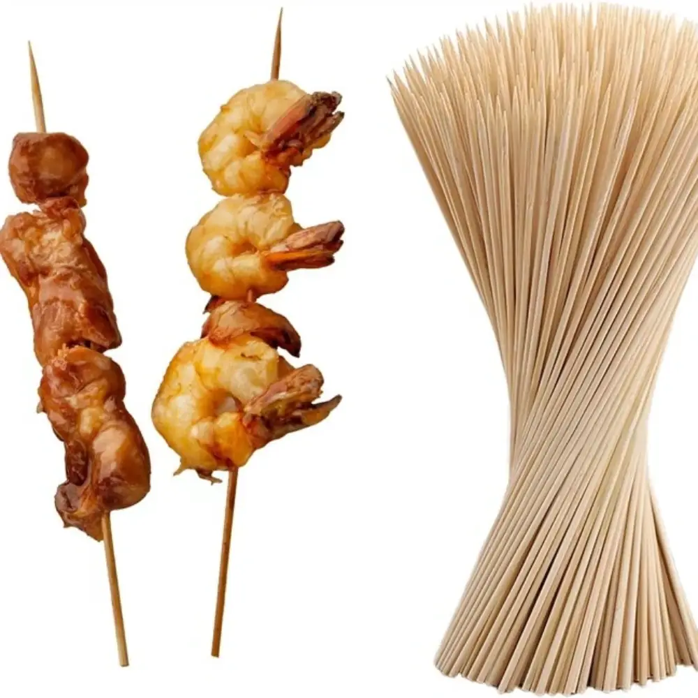 WOODEN BARBEQUE BAMBOO SKEWERS 100 PCS Wooden bamboo barbeque sticks are simple, natural skewers made from durable bamboo and used for grilling and cooking. They are lightweight, smooth, and strong enough to hold pieces of meat, fish, vegetables, or fruits while cooking on a BBQ grill. Key points: Made from natural bamboo Safe for food use Suitable for grilling kebabs, meat, fish, and vegetables Usually pointed at one end for easy piercing Can be soaked in water before grilling to prevent burning Disposable and easy to use